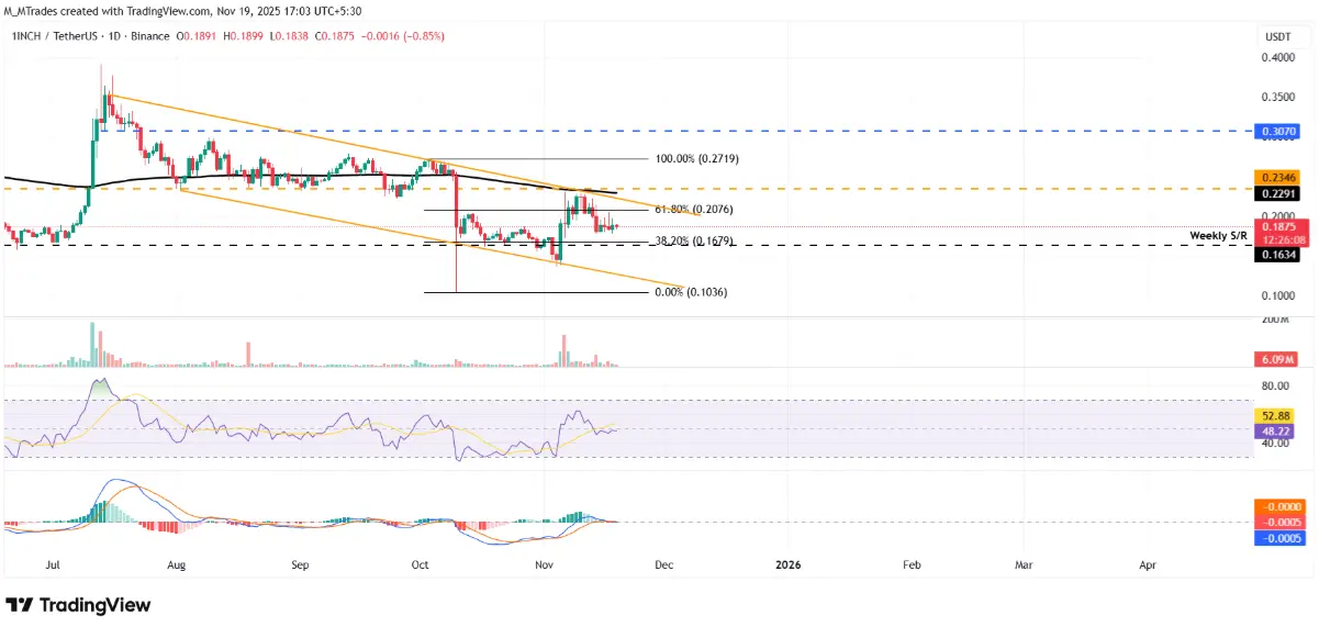 Цена 1INCH немного снизилась с уровня Фибоначчи отскока 61,8% на 0,207 USD в понедельник, но сразу же вернулась в следующей сессии. На момент написания статьи в четверг, эта монета торгуется около 0,187 USD.