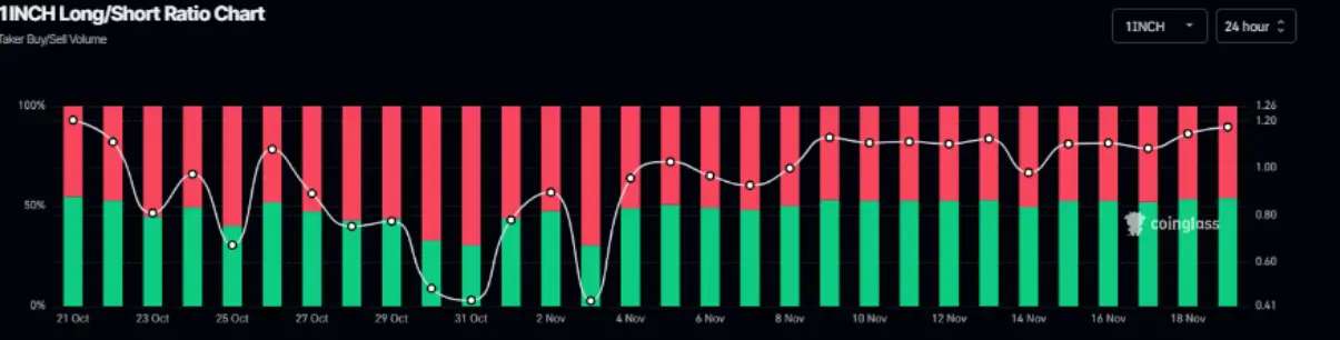 Кроме того, соотношение длинных и коротких позиций 1INCH в настоящее время составляет 1,17 — это максимальное значение за более чем месяц, что показывает, что большинство трейдеров в настоящее время делают ставку на то, что цена 1INCH продолжит расти.