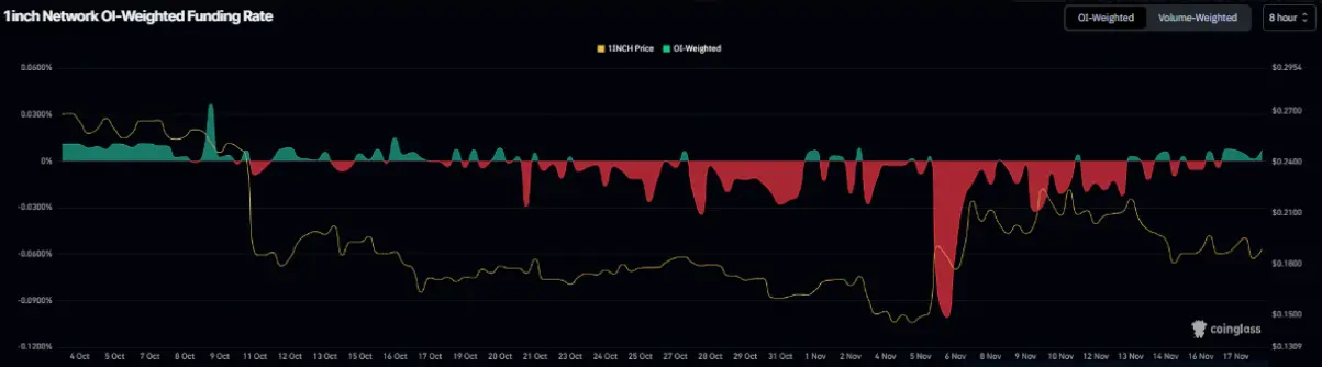 Индикаторы производных также поддерживают этот отскок. По данным Coinglass, коэффициент финансирования показывает, что количество трейдеров, ставящих на снижение цены 1INCH, меньше, чем тех, кто предсказывает рост цены. Этот индикатор перешел на положительный уровень в понедельник и оставался на уровне 0,0070% в четверг, что подразумевает, что держатели длинных позиций платят комиссию коротким. История показывает, что когда этот коэффициент переходит из отрицательного в положительное, 1INCH обычно имеет тенденцию к сильному росту.