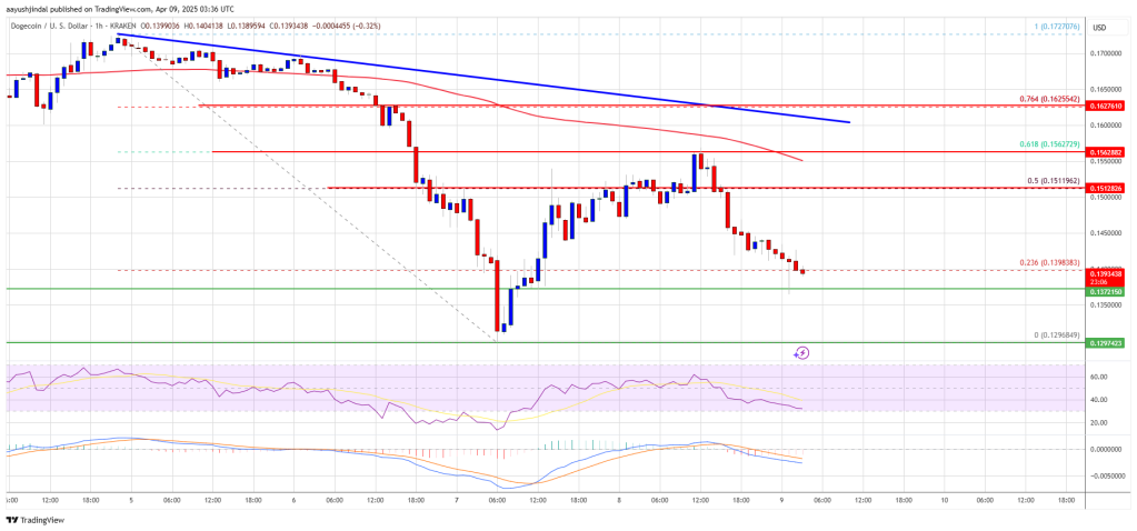 Если цена DOGE не сможет подняться выше уровня $0.150, это может привести к новому падению. Первоначальная поддержка на понижении находится около уровня $0.1380. Следующая основная поддержка находится около уровня $0.1320.