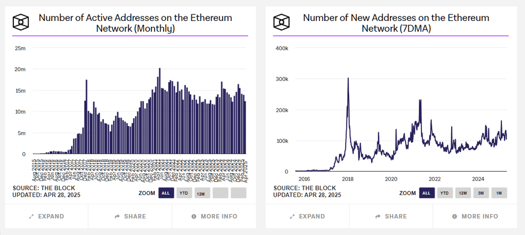 Что еще хуже, ослабление контроля над экосистемой подрывает статус расчетного уровня Ethereum. Рост кроссчейн-протоколов, таких как LayerZero, позволил передавать активы между цепочками, не полагаясь на валидацию основной сети Ethereum. Если эта тенденция сохранится, представление о ETH как о «глобальном расчетном слое» окажется под угрозой краха. Динамика цены валюты подтверждает эту обеспокоенность: среднесуточный объем торгов в цепочке Ethereum составляет менее $3 млрд, газ основной сети долгое время держался на уровне 2 Gwei, а количество активных адресов в марте ниже 15 млн. Снижение ончейн-активности сочеталось с влиянием цены монеты, и ежемесячная выручка валидаторов в основной сети упала ниже $200 млн в марте. С точки зрения настроений инвесторов, снижение возможностей в сети заставило некоторых инвесторов занять выжидательную позицию в отношении будущего потенциала роста Ethereum в краткосрочной перспективе.