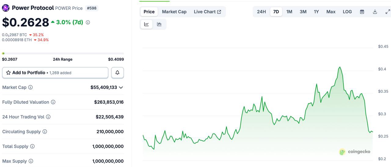 POWER вырос примерно на 3% за последнюю неделю, прорвав раннюю консолидацию и двинувшись к зоне сопротивления $0.38-$0.41. После фиксации прибыли токен откатился к уровню поддержки $0.26-$0.28 — типичная коррекция после ралли, а не структурное разрушение.
