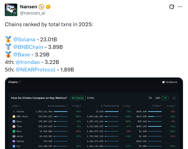 NEAR Protocol заняла пятое место с 1,89 миллиарда транзакций в 2025 году, согласно рейтингу Nansen.