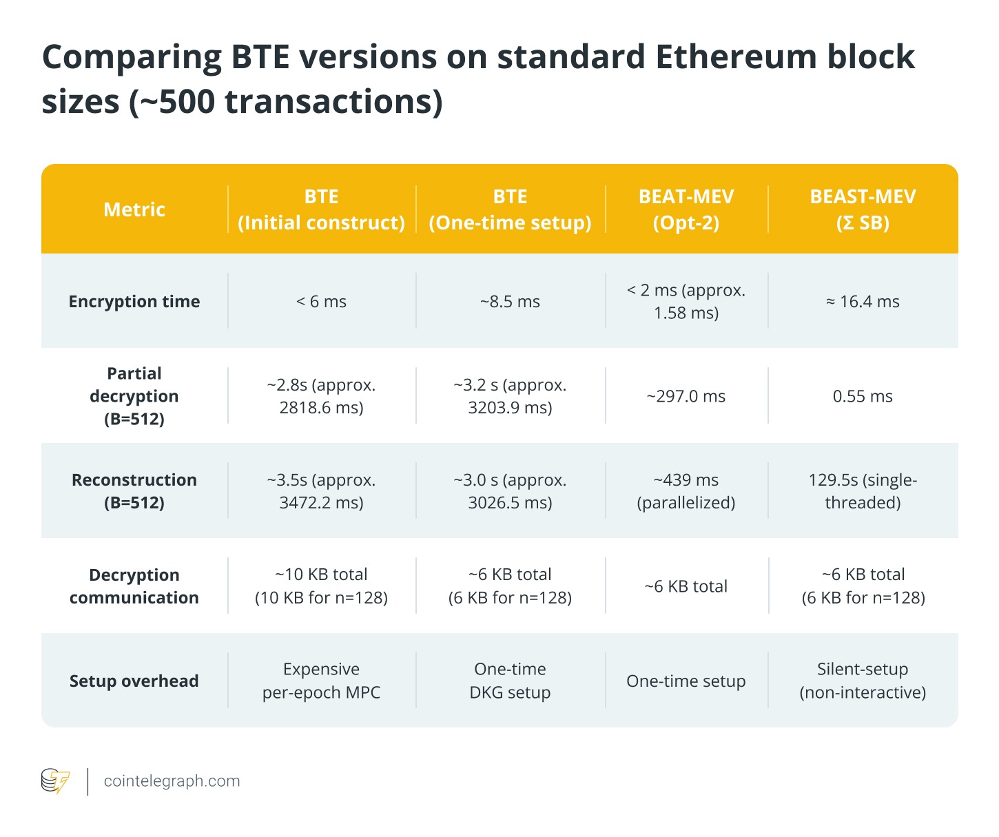 Ancak, tüm kısmi deşifrelemelerin bir araya getirilmesi yine de yoğun etkileşimli hesaplama gerektiriyordu. Bunu düzeltmek için, BEAST-MEV, BEAT-MEV'nin alt-batch tekniğini ödünç aldı ve sistemi büyük partileri ( bir saniye içinde 512 işlemlere kadar ) deşifre etmesine izin vermek için paralel işlemeyi kullandı. Aşağıdaki tablo, her bir ardışık BTE tasarımının orijinal BTE tasarımını nasıl geliştirdiğini özetlemektedir.