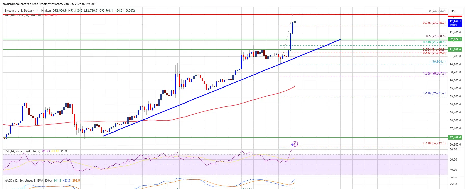 It even surpassed $92,000. A new multi-week high was formed at $93,333 and the price is now consolidating gains. It is stable above the 23.6% Fib retracement level of the recent upward move from the $90,804 swing low to the $93,333 high.