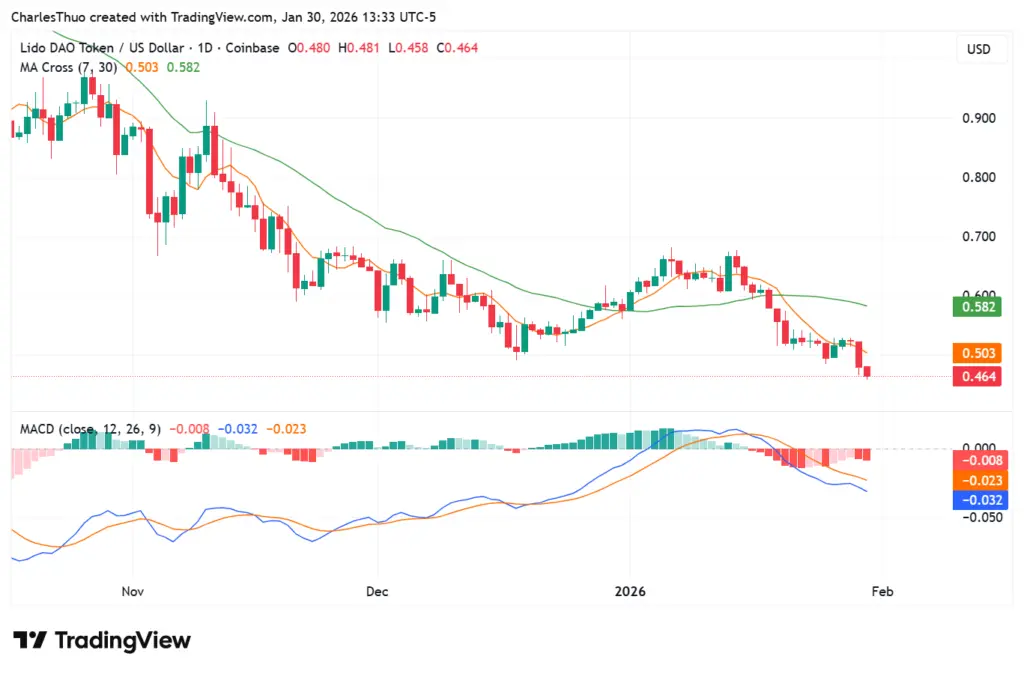 A clean break below this zone could expose LDO to a move toward $0.42 and potentially the $0.40 area.