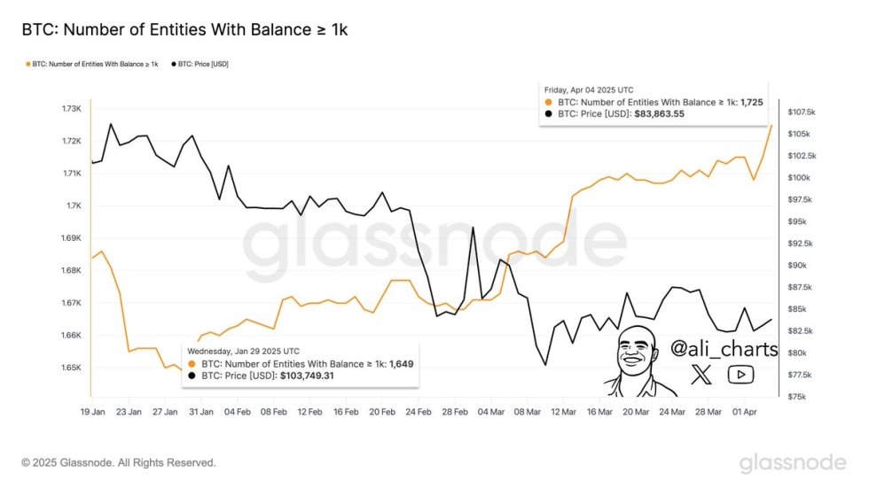 Пов’язане читання: Запаси Ethereum на біржах різко знизилися – Чи настане дефіцит постачання? Незважаючи на інтенсивний тиск, з’являються сигнали, що деякі довгострокові гравці все ще бачать цінність на цих рівнях. Згідно з нещодавніми даними Glassnode, 76 нових сутностей, які володіють понад 1,000 BTC, приєдналися до мережі за останні два місяці. Це збільшення на 4,6% серед великих власників — часто асоційованих з інституційними гравцями або особами з високим статком — додає краплю надії серед похмурості. Історично накопичення китів під час спадів передувало фазам відновлення в ціновому циклі Bitcoin.
