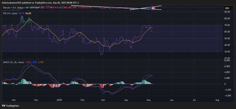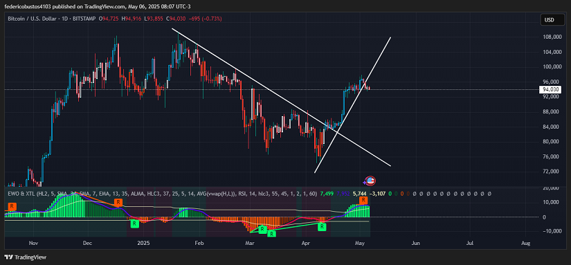 З технічної точки зору (щоденна компресія), порушення висхідної трендової лінії, що почалася на початку квітня, є значним розвитком. Біткойн перевищив $97,000 минулої п’ятниці, але знизився впродовж вихідних і зараз коливається навколо $94,030, показуючи незначне зниження на 0.73% за останні 24 години.