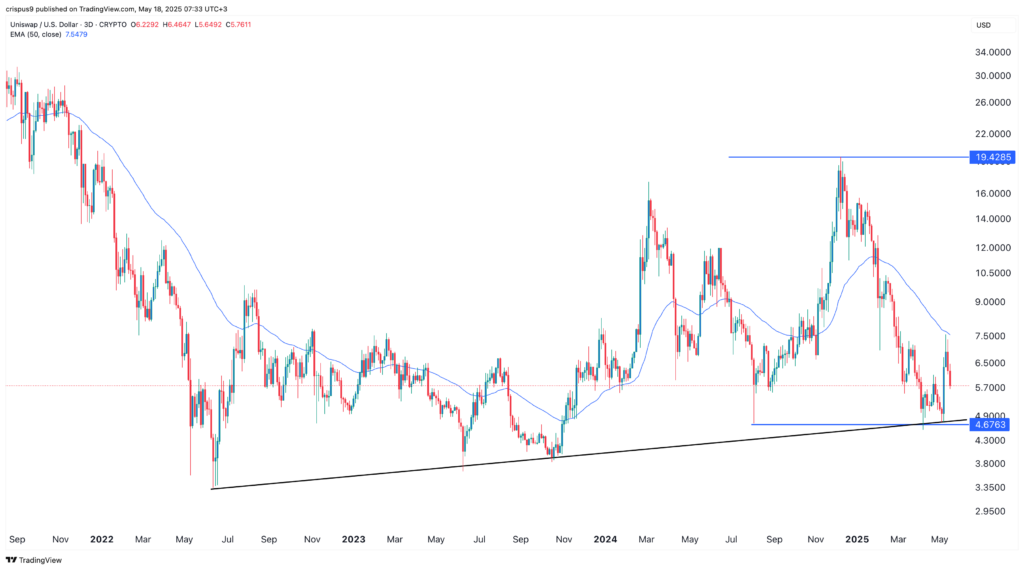 3-денний графік показує, що ціна UNI досягла піку на $19.42 у листопаді, а потім знизилася до поточних $5.7. Її нещодавня спроба відновлення натрапила на суттєвий опір на 50-денній ковзній середній на $7.54