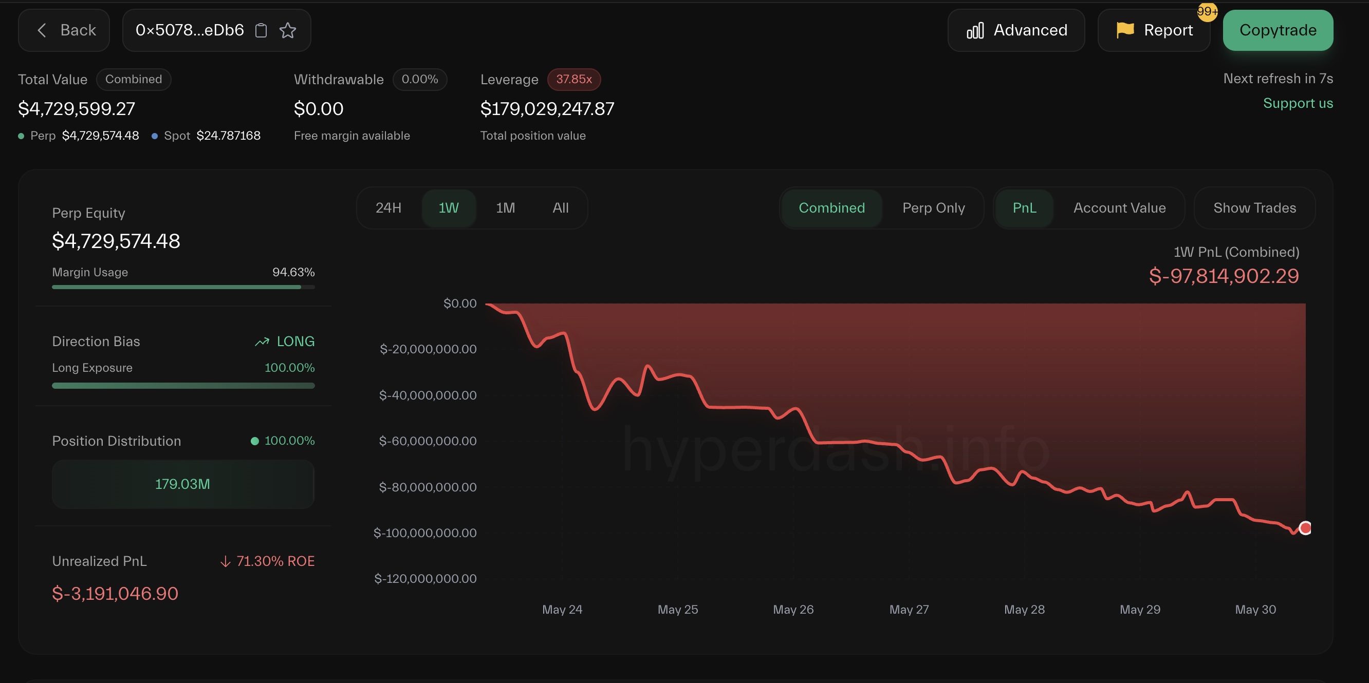 Джеймс Вінн, великий інвестор (cá voi) на ринку криптовалют, щойно ліквідував 949 (BTC) біткойнів, або майже 100 мільйонів доларів, коли ціна біткойна впала нижче позначки в 105 000 доларів. Ця ліквідація ознаменувала збитки в розмірі понад 97,8 мільйона доларів лише за один тиждень, що відображає жадібність і психологію азартних ігор на сучасному крипторинку. Відомо, що Джеймсу всього 17 років, він виходить на ринок з 14 років.