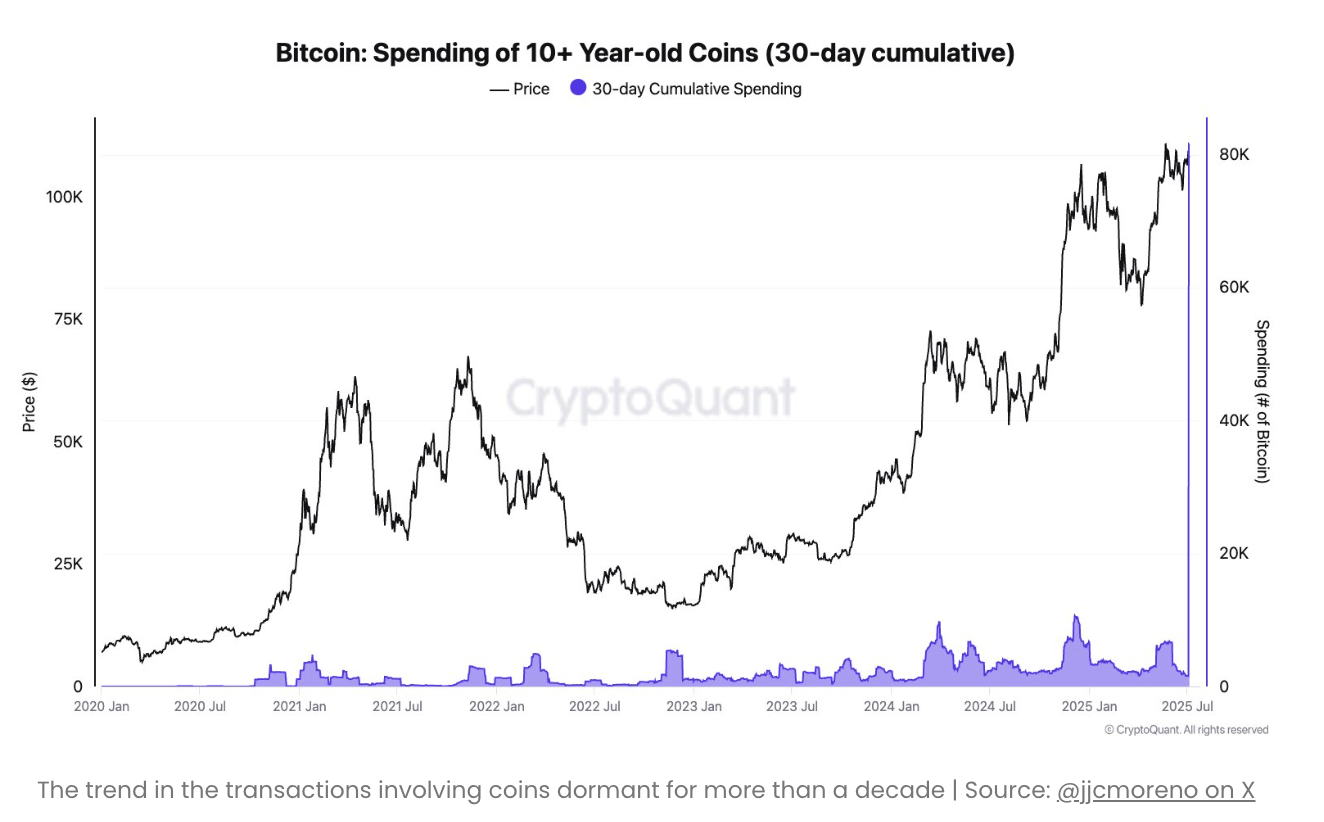 On-chain динаміка: величезний “древній” біткойн переміщення викликає увагу Водночас, керівник досліджень CryptoQuant Хуліо Морено (Julio Moreno) в X зазначив, що в мережі біткоїна нещодавно відбулася наймасштабніша за всю історію переміщення “древніх” токенів віком понад десять років.