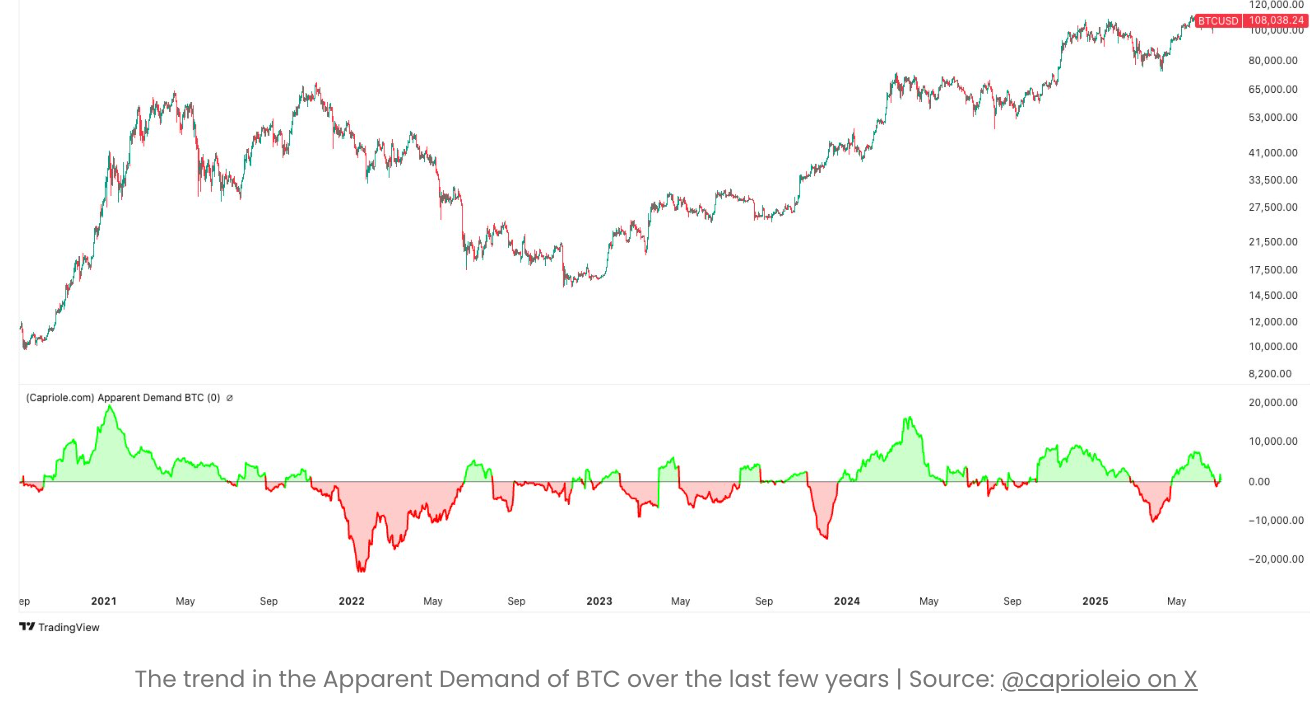 Попит залишається сильним, основи бичачого ринку не змінилися? Варто зазначити, що в іншому пості на X Едвардс пояснив, що, незважаючи на таку величезну міграцію токенів, індикатор явного попиту (Apparent Demand) на біткойн продовжує залишатися позитивним (бичачим). Цей індикатор вимірює фактичний попит на ринку, порівнюючи нову продукцію біткойна (видобуток майнерів) з запасами (обсяг постачання, що не переміщувався більше року).