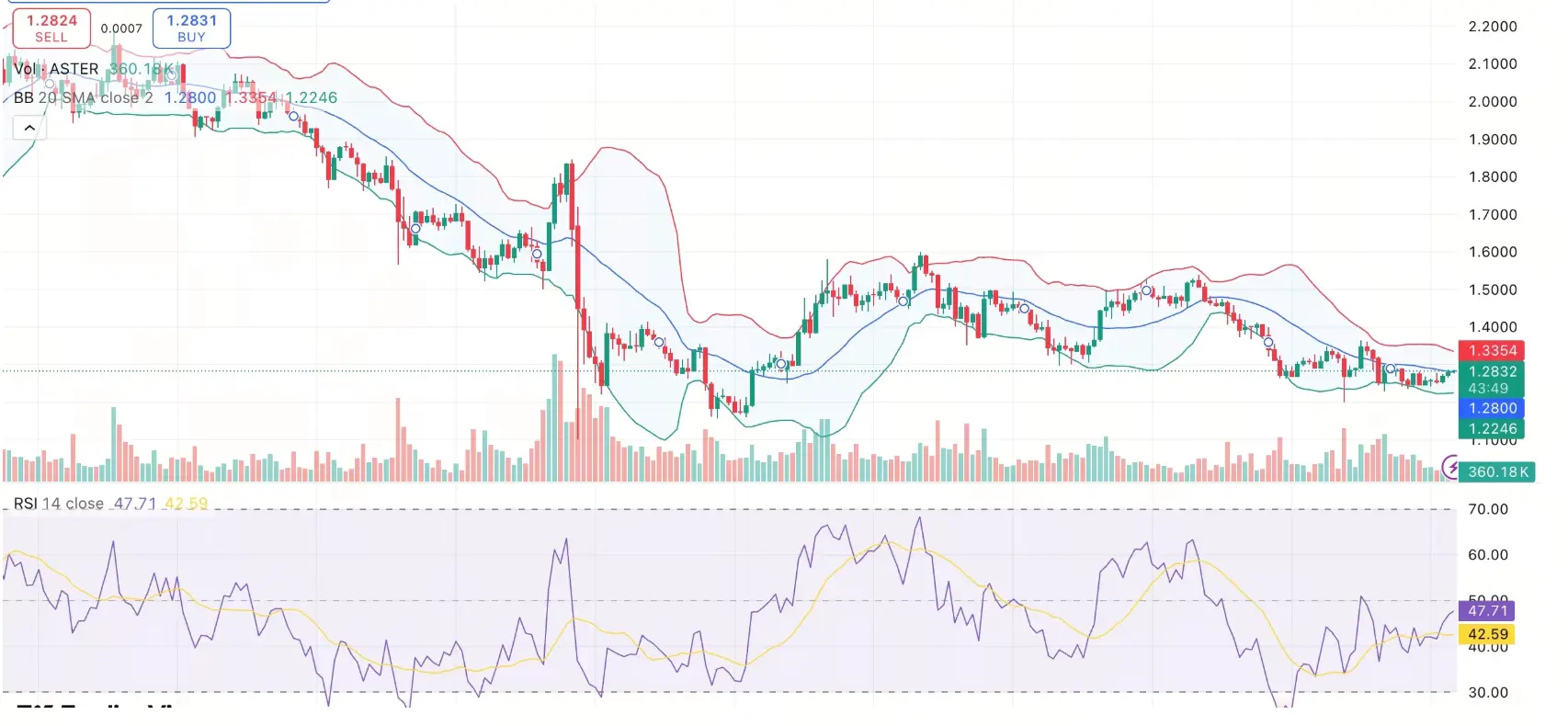 Ціна токена ASTER наразі торгується близько 1,28 долара, ринок готується до сьогоднішнього запуску на одній з основних бірж, що, як очікується, викличе коливання цін. Незважаючи на те, що цей токен за останній тиждень впав майже на 20%, об'єм спотової торгівлі за 24 години різко зріс на 17,7% до 1,21 мільярда доларів, що свідчить про помітне відновлення участі на ринку. Технічний аналіз свідчить, що ASTER перебуває в нейтральному до трохи бичачому стані, і в короткостроковій перспективі, ймовірно, подолає рівень в 1,34 долара.