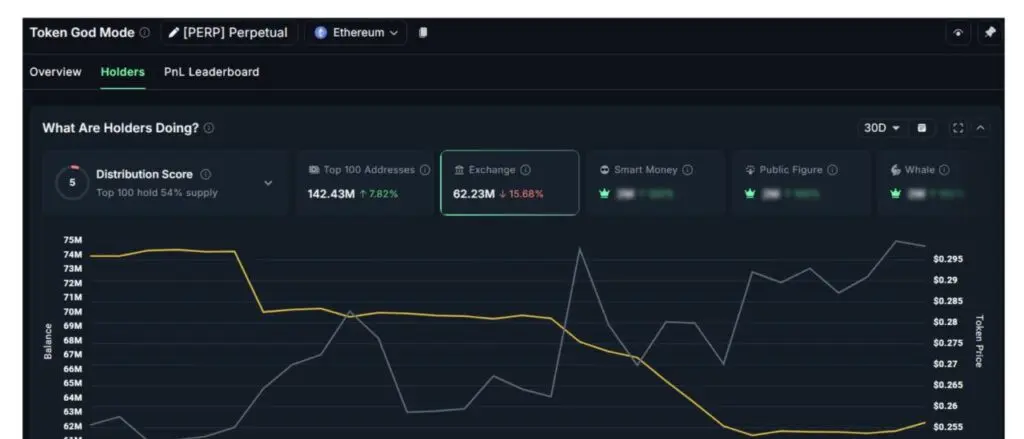 Проте, відновлений інтерес інвесторів до наративу Perp DEX зміг привернути нову увагу до токена. Дані показали, що резерви PERP на біржах зменшилися більше ніж на 15,6% за минулий місяць, в той час як залишки в гаманцях китів зросли на 7,8%.