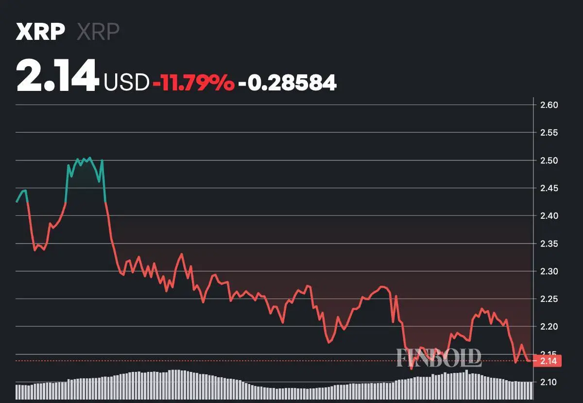 Протягом останніх 24 годин XRP впав на 1,6% до $2,14, що є гіршим результатом у порівнянні з ширшим ринком цифрових активів, який зафіксував скромне зростання на 0,24%. Ця дивергенція вказує на зниження настроїв інвесторів, особливо після того, як недавня динаміка, зумовлена оптимізмом щодо ETF, втратила сили.