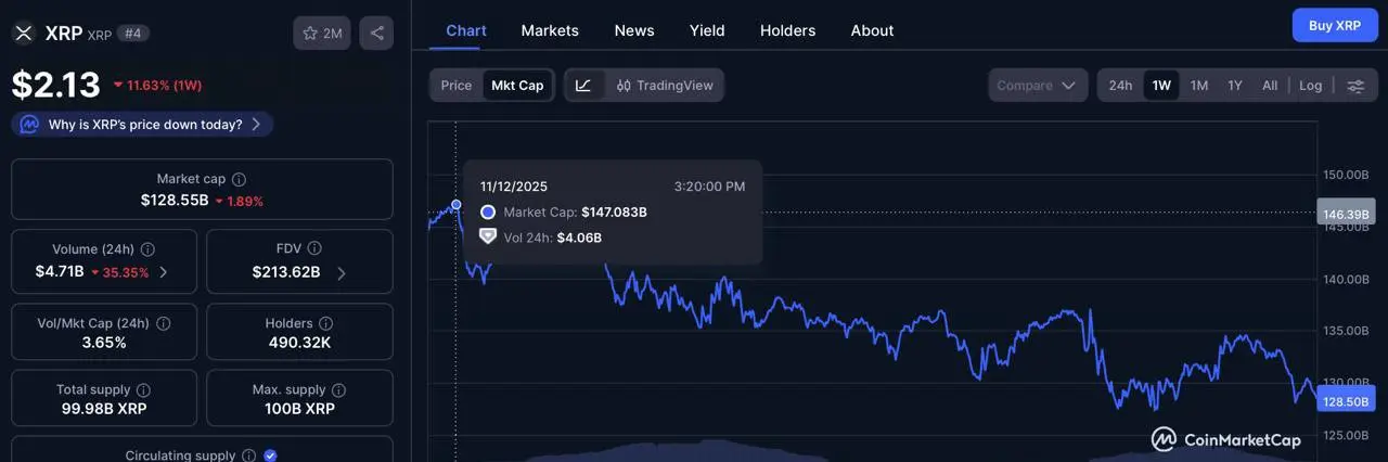 XRP стер майже $19 мільярдів у ринковій вартості за останні сім днів, впавши з $147.08 мільярдів 12 листопада до лише $128.50 мільярдів сьогодні, згідно з даними CoinMarketCap. Поки що ширший крипторинок показав незначне відновлення за той же період, XRP важко було втримати свої позиції, що вказує на зростаючу слабкість під поверхнею.