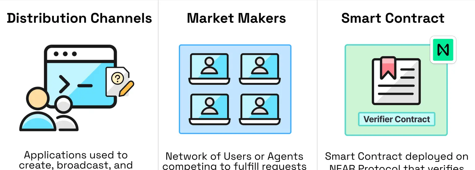 Механіка NEAR Intents включає три основні компоненти: програми для створення та трансляції намірів, розв'язувачів, які змагаються за їх виконання, та смарт-контракт на блокчейні NEAR, який перевіряє та завершує транзакції. Користувачі ініціюють процес через гаманці, біржі або децентралізовані додатки, транслюючи свій намір в мережу, де розв'язувачі відповідають пропозиціями та планами виконання.