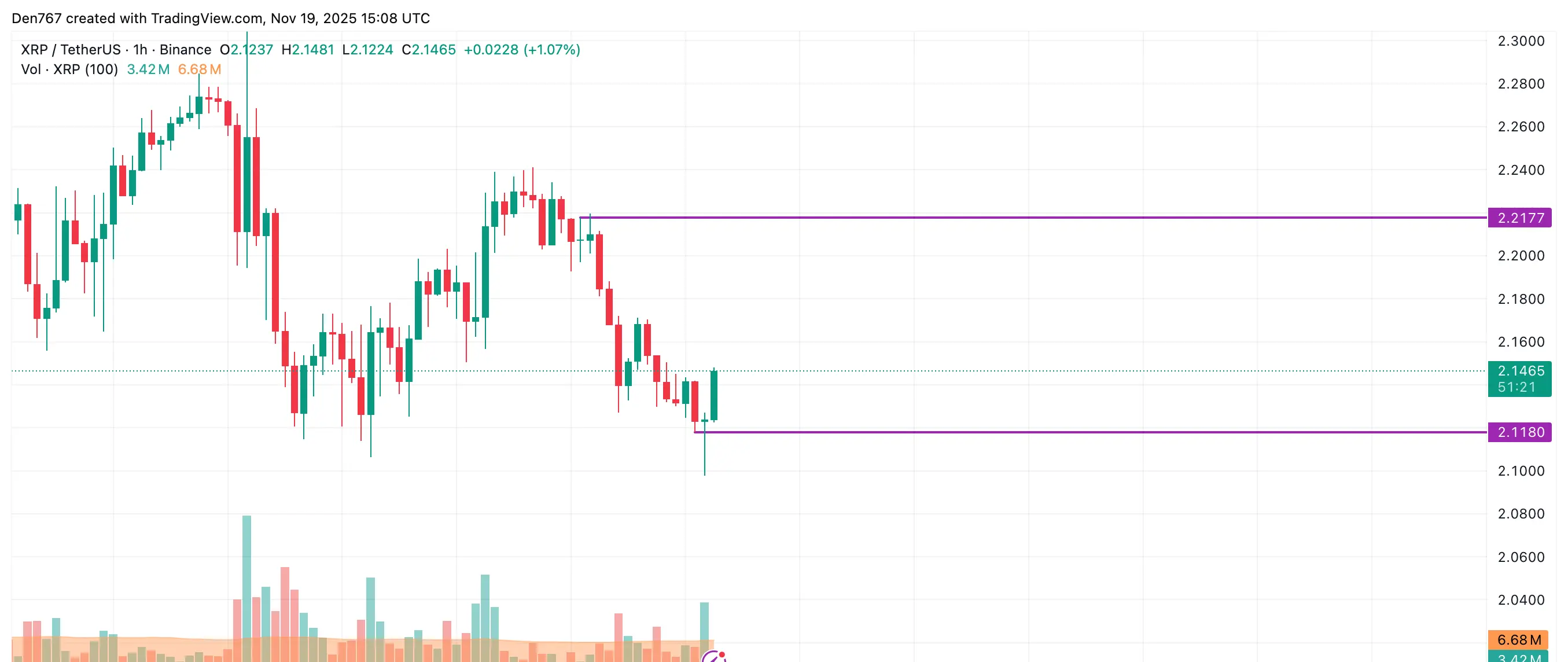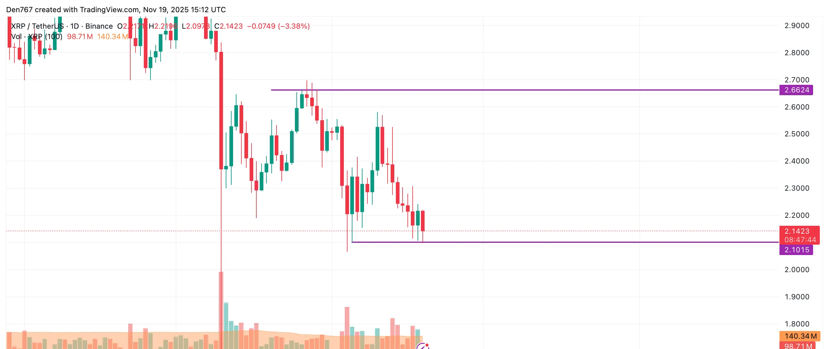 На довшому часовому інтервалі ціна XRP торгується поблизу підтримки $2.1015. Якщо відбудеться прорив, накопичена енергія може бути достатньою для більш глибокого зниження до зони $2 .