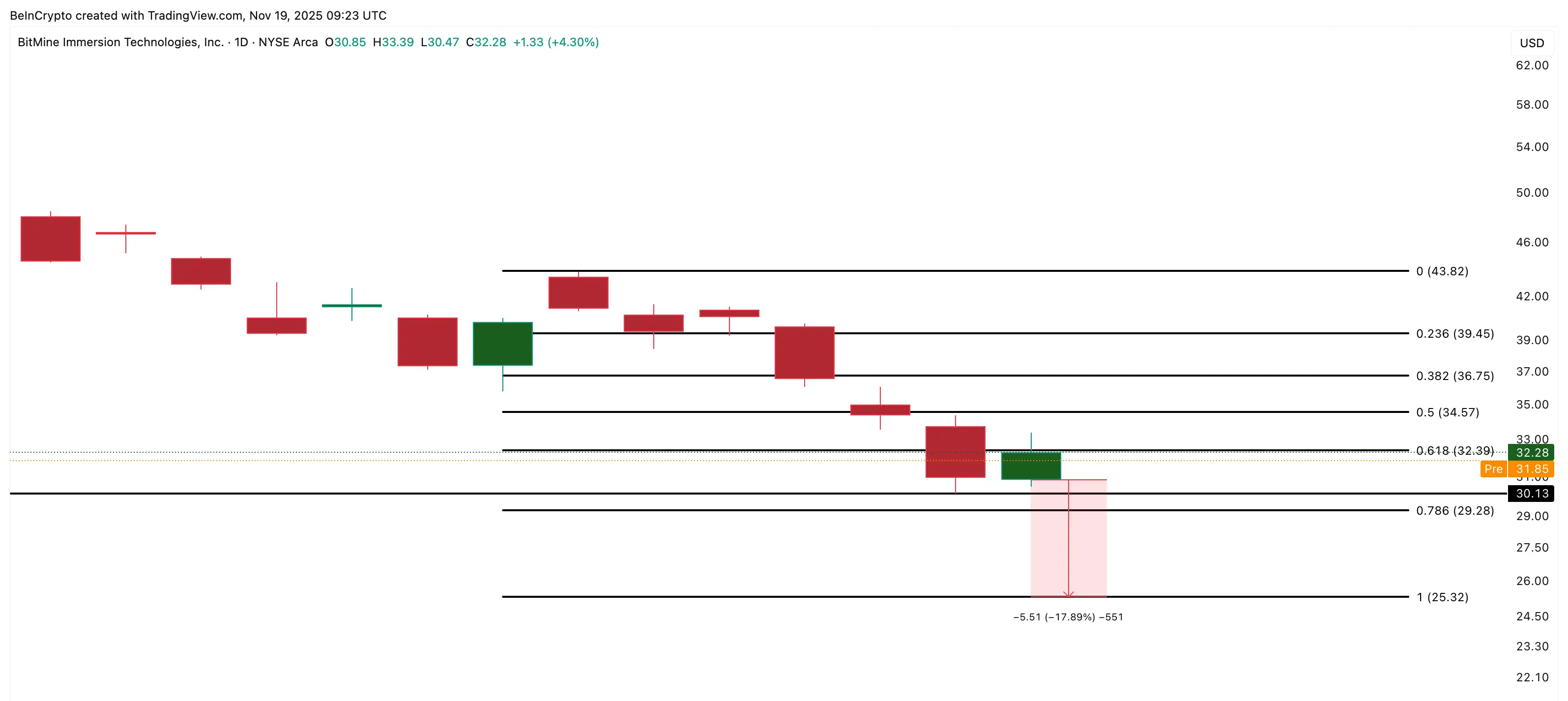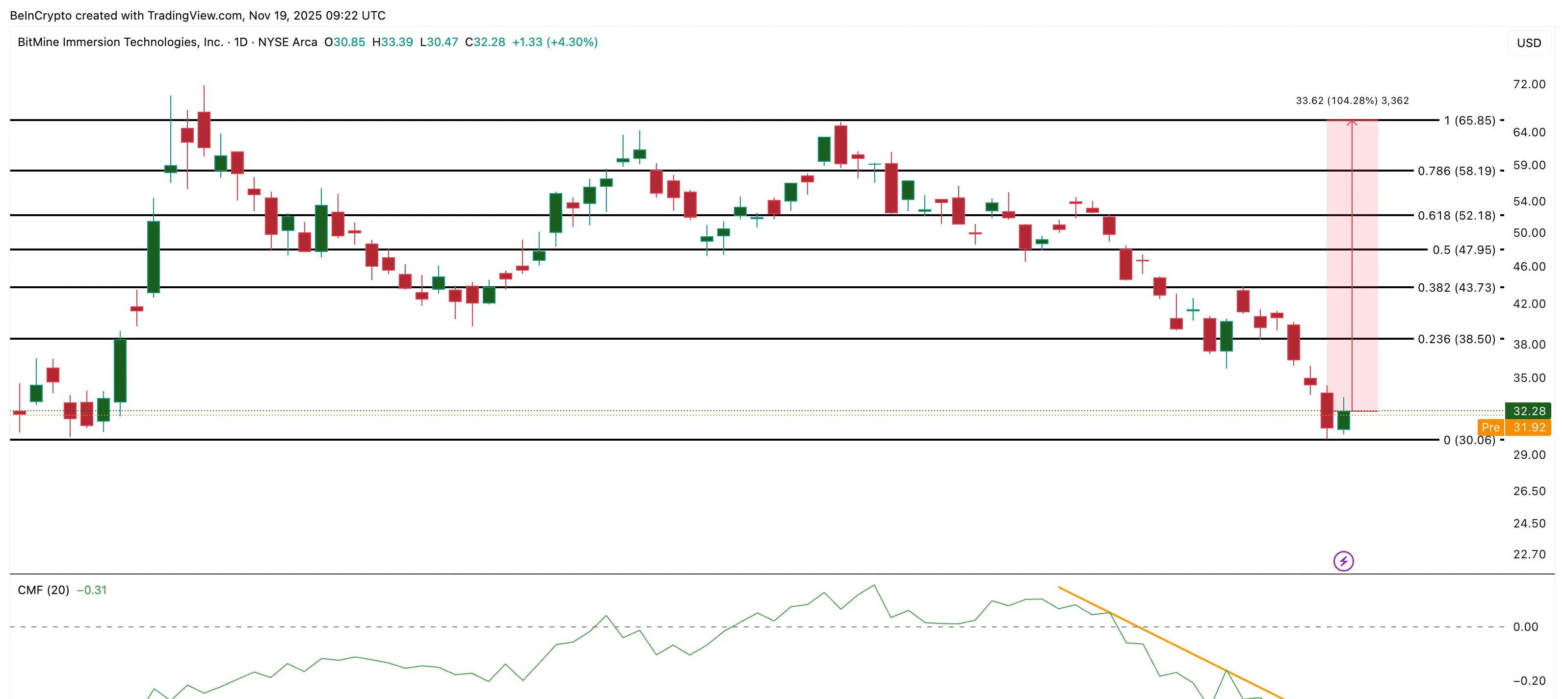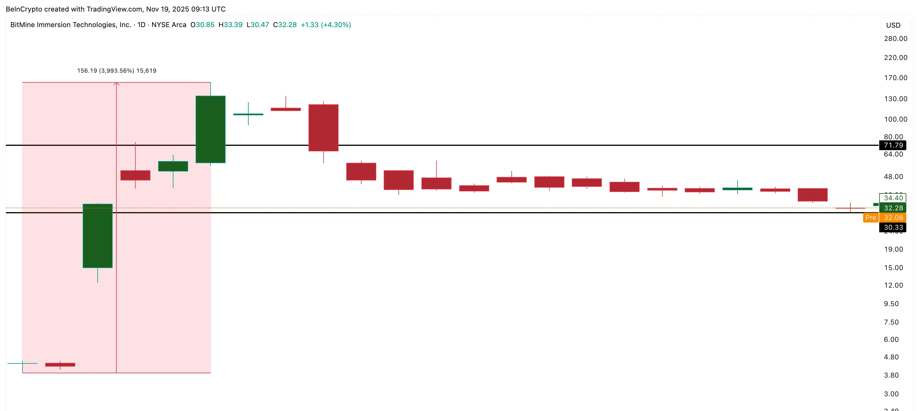 BMNR утримував $30 як основну підтримку з початку серпня. Стабілізація акцій наразі показує, що цей рівень все ще активний.