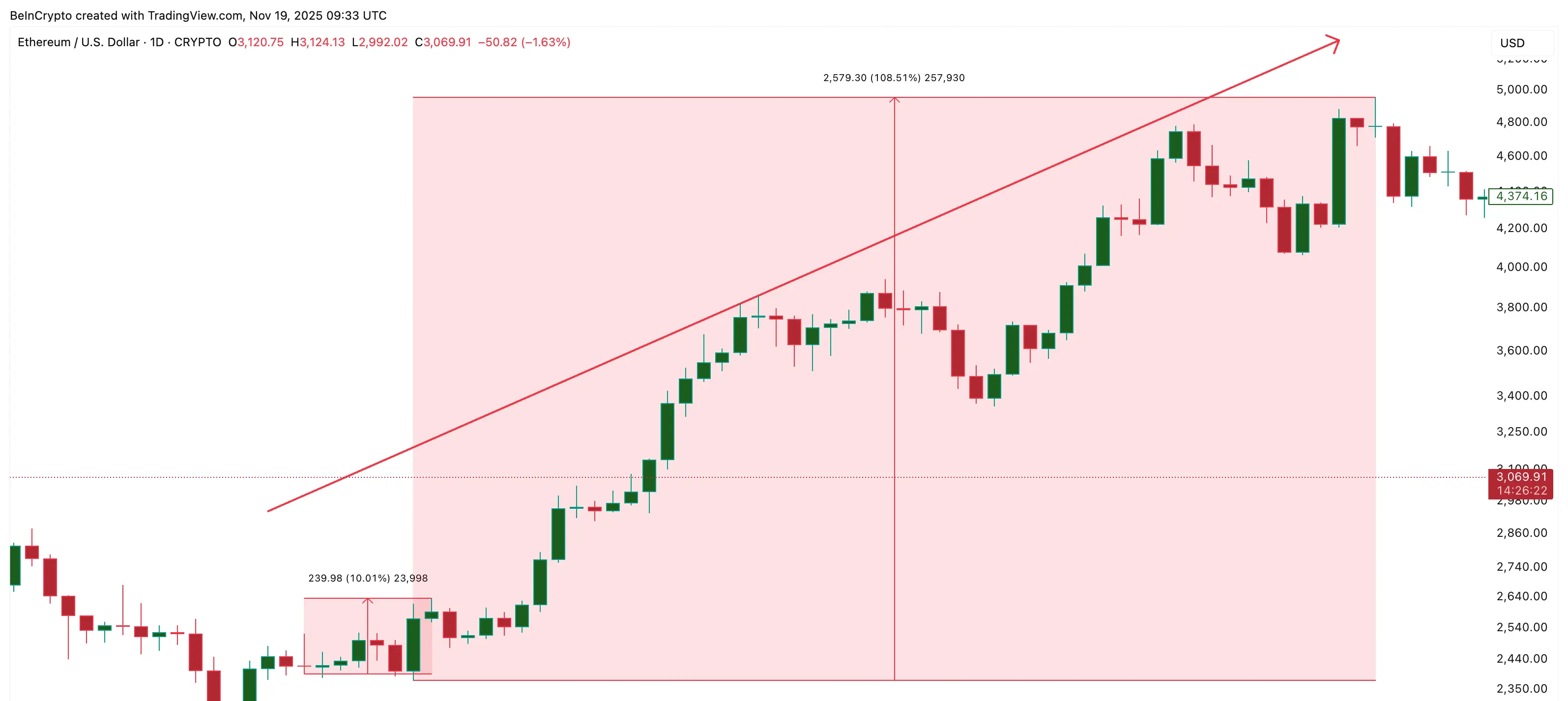 Лише після вибуху BMNR Ethereum почав свій справжній ріст, зрісши більш ніж на 100% з початку липня до кінця серпня. BMNR явно врахував цей рух раніше, демонструючи патерн реакції на очікування, а не на сам рух.