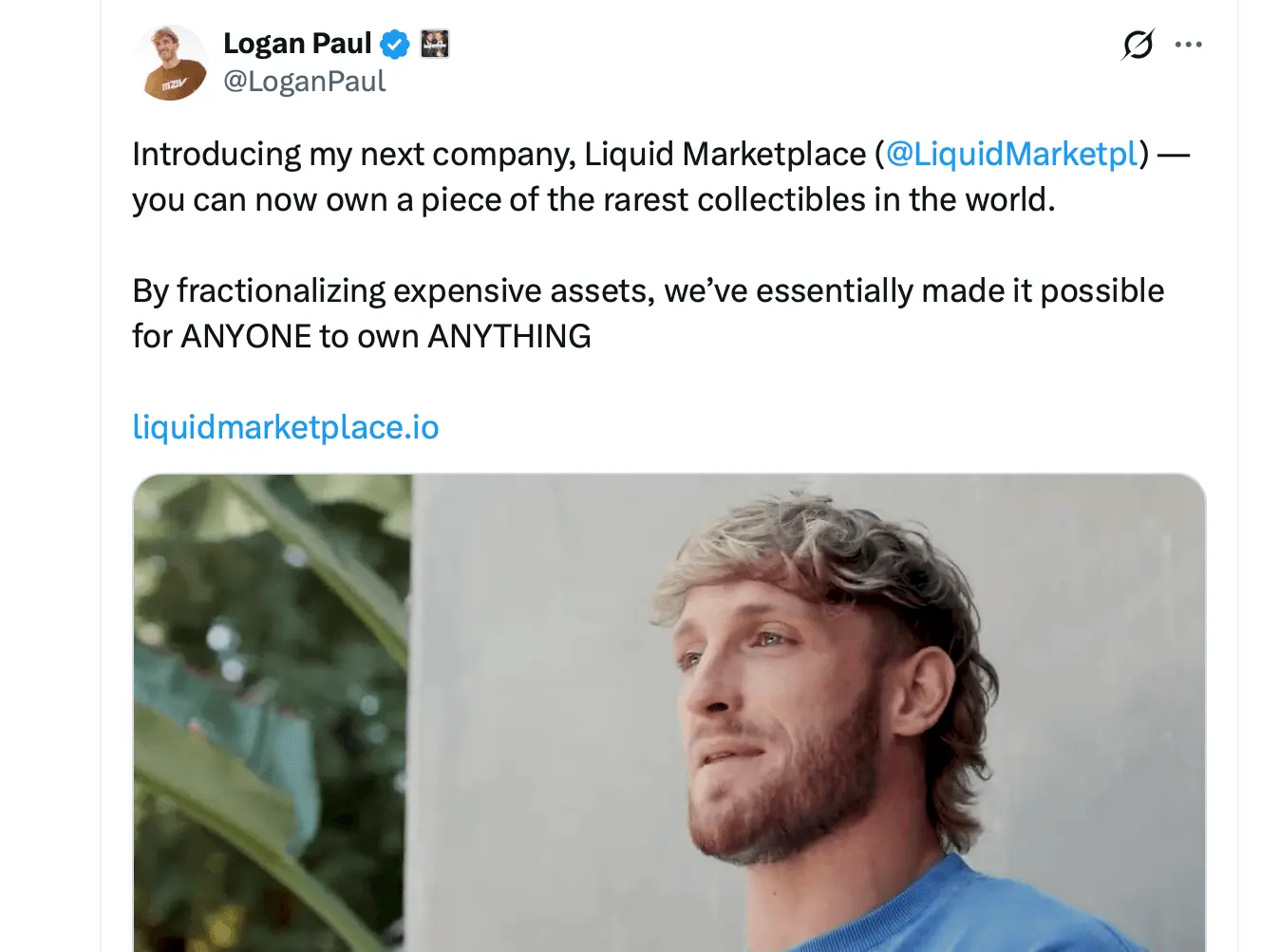 Крім цінових спекуляцій і ентузіазму прогнозних ринків, карта Pikachu Illustrator Логана Пола також пов’язана з нерозв’язаним спором щодо його участі у Liquid Marketplace — платформі для інвестицій у колекційні предмети, запущеній у 2022 році, яка прагнула дробити власність на високовартісні активи.