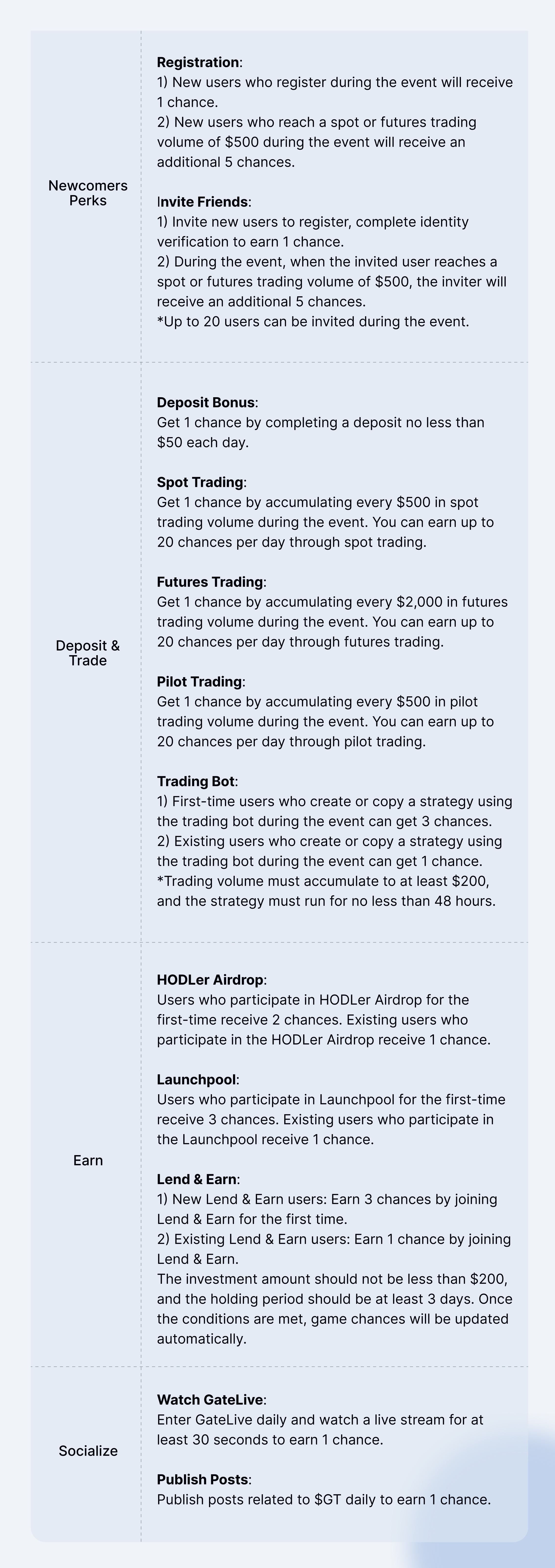 - Nếu người dùng tham gia các hoạt động khác của Gate cùng lúc, người đó sẽ chỉ nhận được phần thưởng từ một hoạt động.