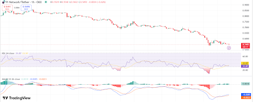 Theo biểu đồ giá Pi trên khung thời gian 1 giờ, loại tiền điện tử này thể hiện hành vi giảm giá vì nó hiện đang ở mức $0.5493 sau khi giảm 0.62% trong ngày trước đó. RSI báo cáo giá trị 31.87 cho thấy Pi đang hướng tới các vị trí bán quá mức, điều này gợi ý hoặc là một sự đảo chiều của thị trường hoặc một xu hướng tăng ngắn hạn. Nhưng áp lực bán vẫn chiếm ưu thế khi các tín hiệu MACD giữ giá trị âm kết hợp với cả đường MACD và đường tín hiệu nằm dưới mức không.