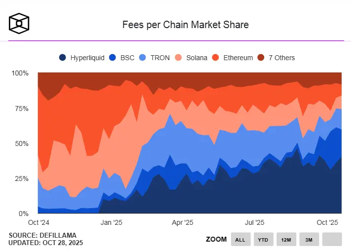 Cục diện phí giao dịch giữa các blockchain Layer 1 lớn đã thay đổi mạnh trong năm nay. Đầu năm, Solana chiếm hơn 50% tổng phí, nhưng nay chỉ còn khoảng 9%, chủ yếu do cạnh tranh gay gắt từ Hyperliquid và BNB Chain. Hai nền tảng này từng chỉ chiếm khoảng 10% tổng phí, nhưng nay đạt hơn 60%, trong đó Hyperliquid chiếm 40% và BNB Chain 20%.