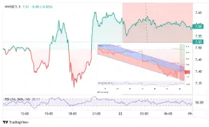 Chỉ số NWSBCT cho Blue Chips: Chỉ số giao dịch theo thời gian thực, mô phỏng thị trường rộng sử dụng bộ con Blue-chip(, thường gọi là “Blue Chips.” Biểu đồ hàng ngày cho thấy khả năng lãnh đạo vẫn bị tổn thương cấu trúc: giá vẫn dưới mức Fibonacci 0.236 )~7.83( và nằm trong khoảng giữa 7.4. Biểu đồ cho thấy sự ổn định sau đợt dao động mạnh. 📍Tính đến 9:00 CET, giá quanh mức 7.59.