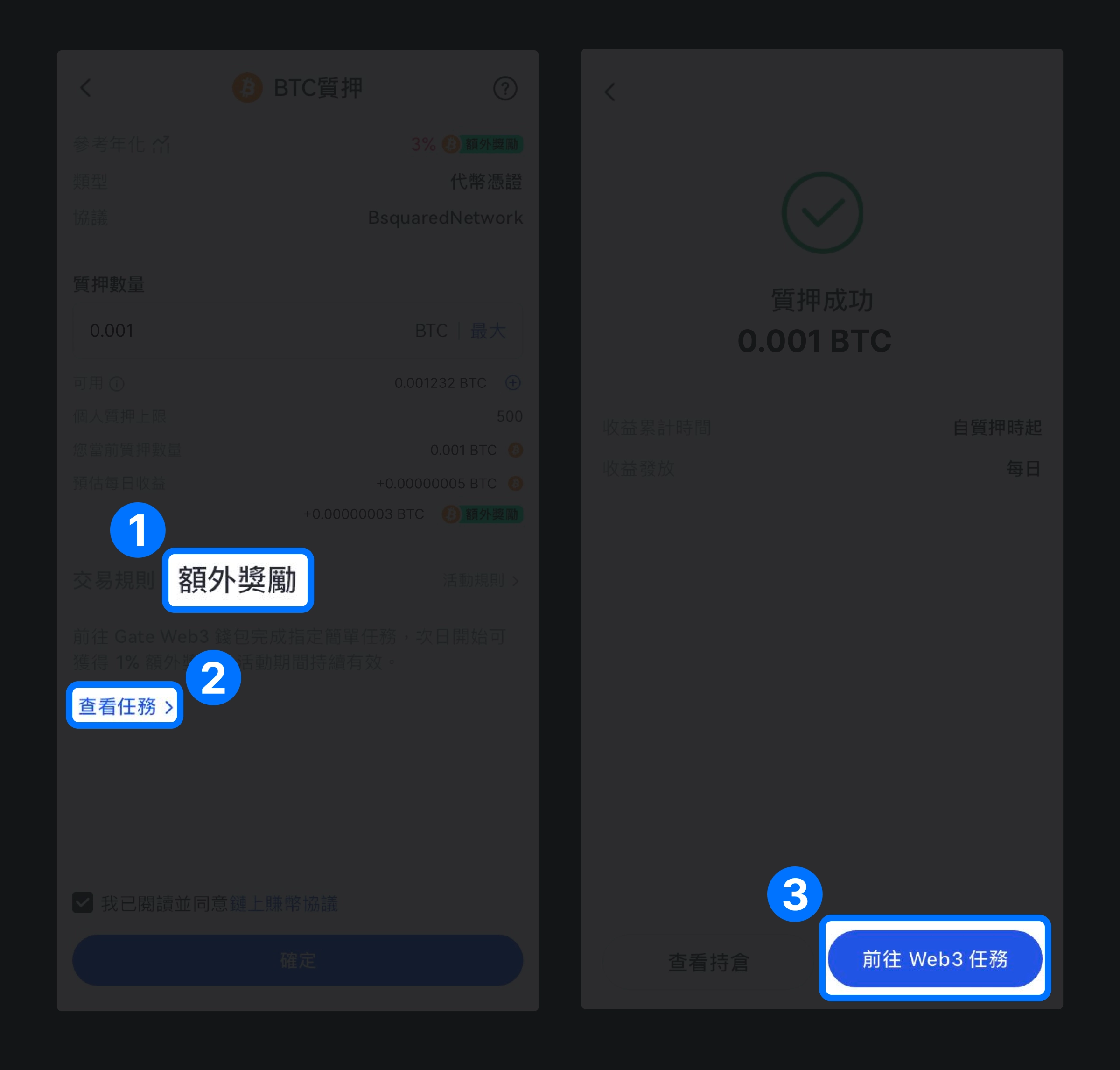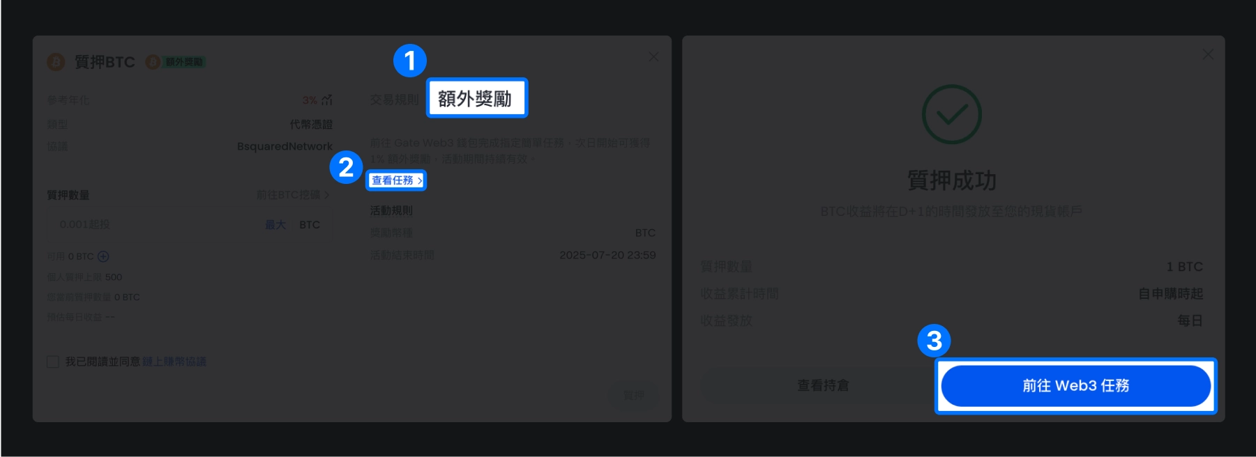 - 額外獎勵:1% (需完成 Web3 指定任務,次日生效,未完成則無獎勵,獎勵幣種爲 BTC)
