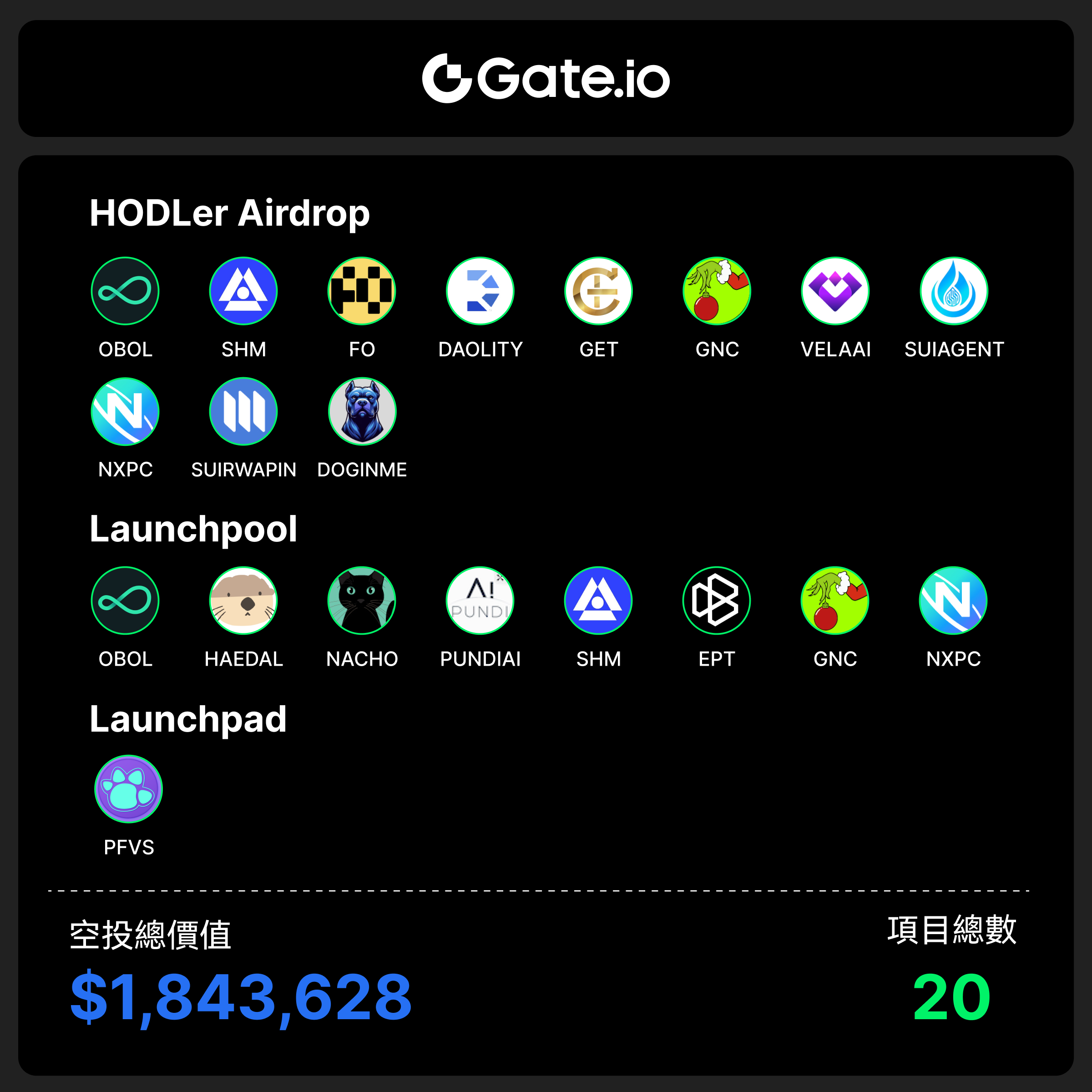 本週期Gate上線了14個新項目,1個Gate Launchpad項目、11個HODLer Airdrop免費空投和8個Gate Launchpool項目,總空投價值爲$1,843,628。