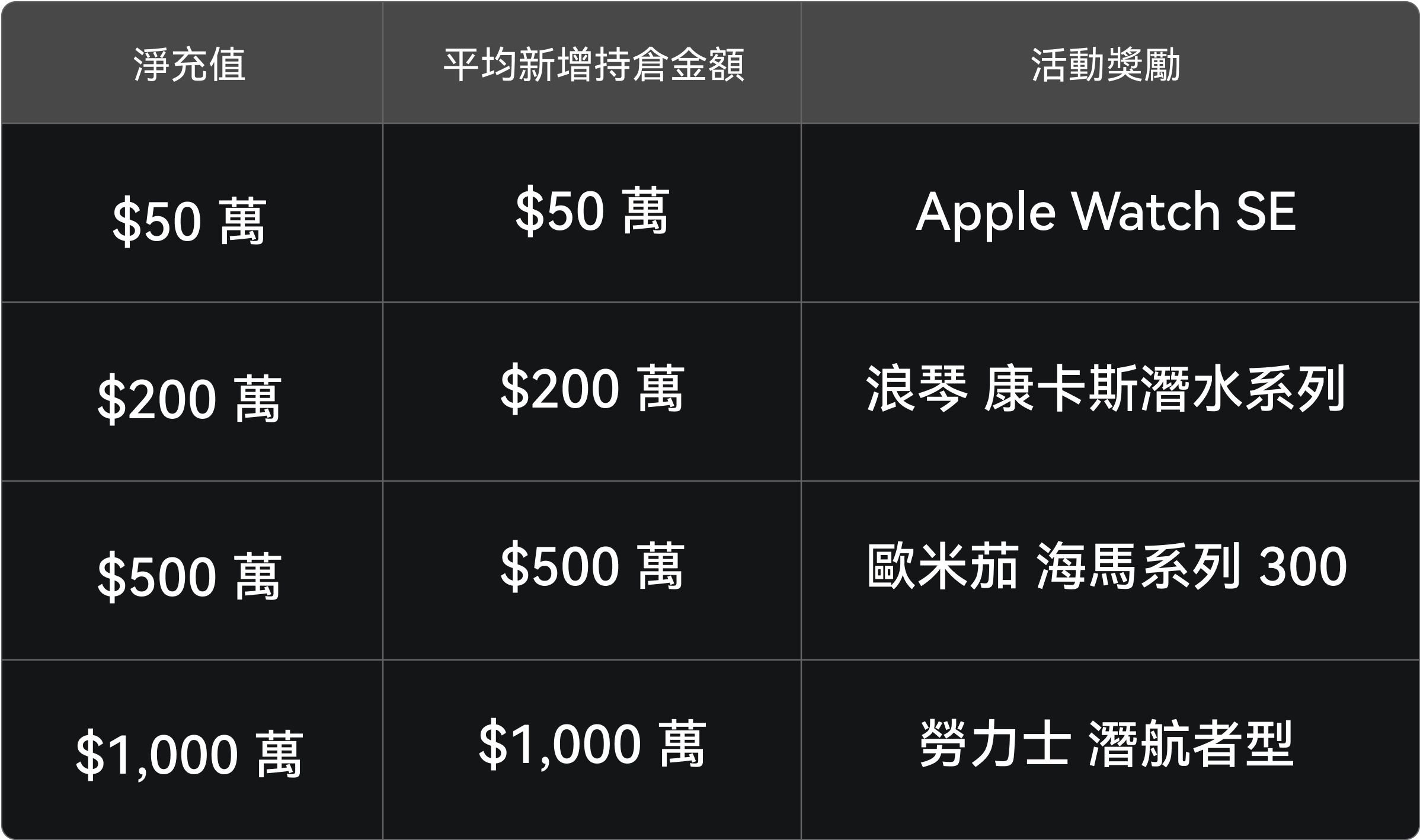VIP 用戶根據其報名後 30 日的淨充值及餘幣寶 30 日平均新增持倉金額(含活期與定期),解鎖對應獎勵,最高可領勞力士腕表。