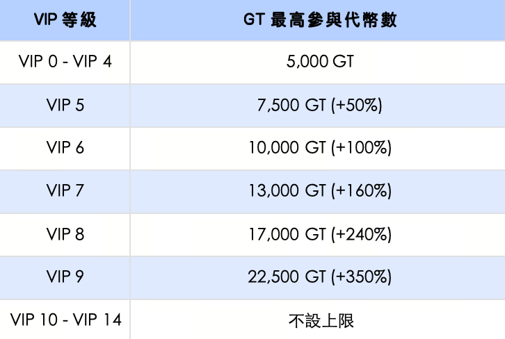 完成身分認證;GT 持倉 ≥ 1 GT,可按照 GT 持倉快照量佔比瓜分總獎池。每位 VIP 0–VIP 4 用戶本次活動參與上限為 5,000 GT,VIP 10 及以上用戶最高可享【不設上限】的參與額度。