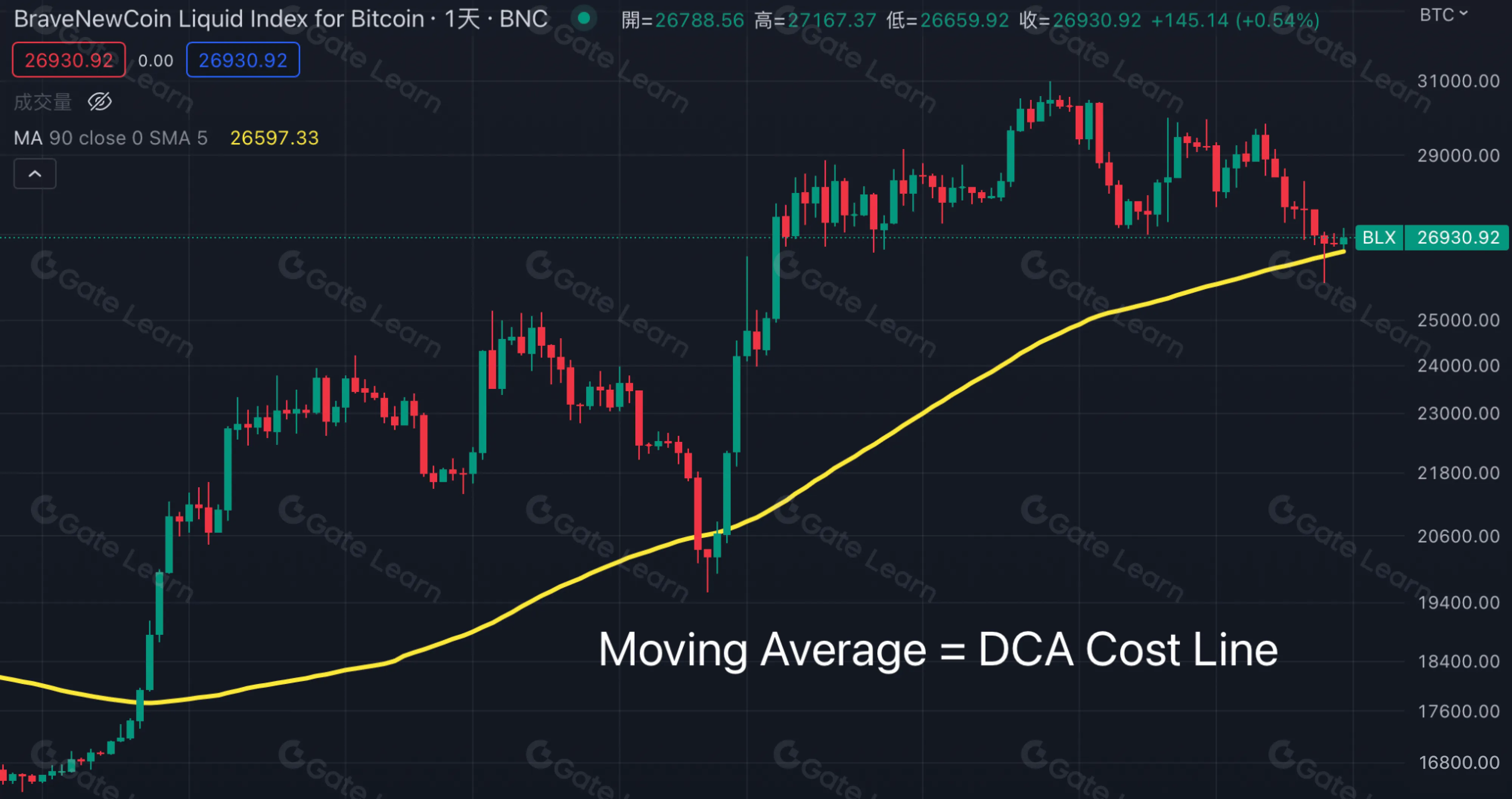 當標的資產的市場價格在均線之上時,代表您的定投策略處於盈利狀態,您可以考慮是否要繼續定投,也可以選擇獲利了結。相反地,若標的資產的市場價格在均線之下,表示您目前的持倉為虧損狀態,應該繼續定投靜待行情反轉。