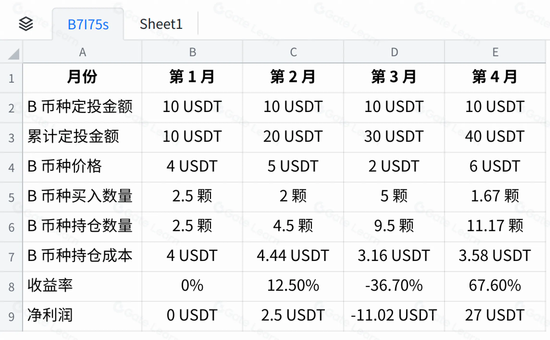 以下表為例,每月定投 10 USDT 購買 B 幣種,價格上漲時買進數量減少,下跌時買進數量增加。雖然在下跌階段會承受持倉虧損,但也因為加倉買入,使得後面上漲時獲得更高的收益。