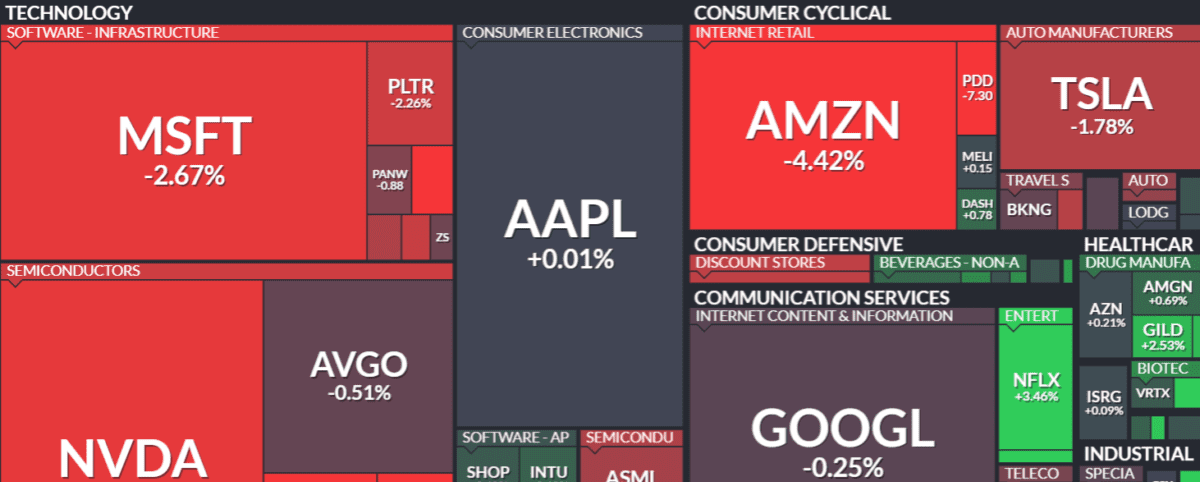 當天的下跌由包括英偉達在內的大型科技股主導。英偉達下跌2.7%,在第三季度業績發布前一天惡化了投資情緒。亞馬遜和微軟也分別下跌4.3%和2.7%,擴大了下跌趨勢。市場預計英偉達此次業績每股收益(EPS)爲1.25美元,銷售額爲550億美元,這分別比去年同期增長了54%和57%。