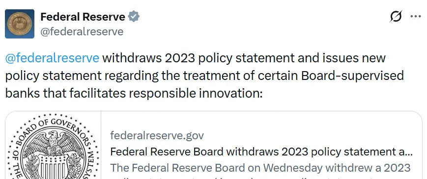 來源:Cointime 原標題:美聯儲撤回限制其銀行與加密貨幣互動的指導方針 原連結: 美國聯邦儲備委員會已撤回2023年的指導方針,該方針限制了由聯邦儲備監管的銀行(包括無保險銀行)與加密貨幣的互動,因為美國監管機構持續積極轉向數字資產。