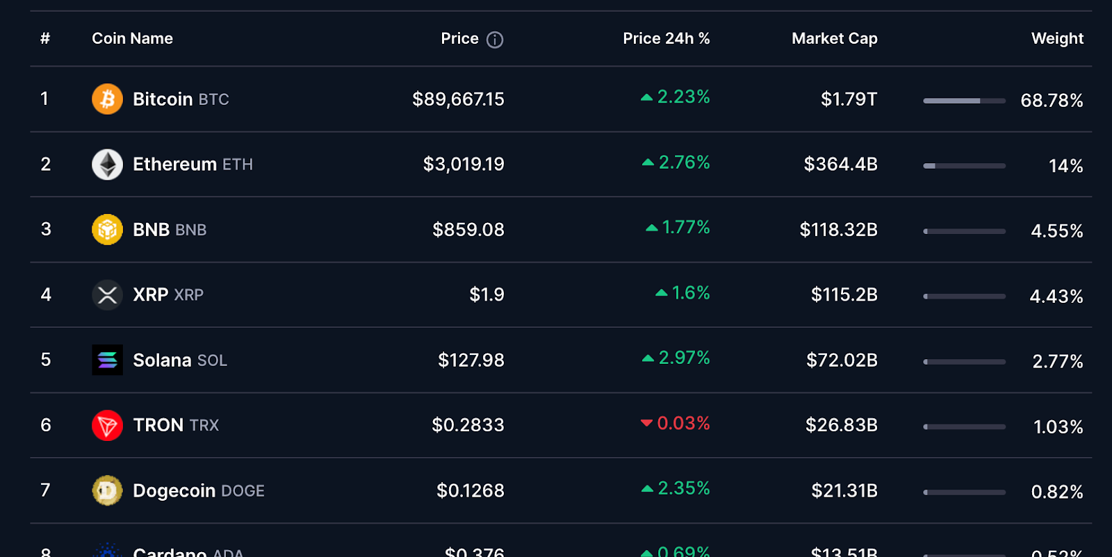 在今日短暫重返$90,000水準後,比特幣目前交易於$89,834,較昨日上漲2.4%。過去一週漲幅為1.2%,已將月度跌幅縮小至1.1%。