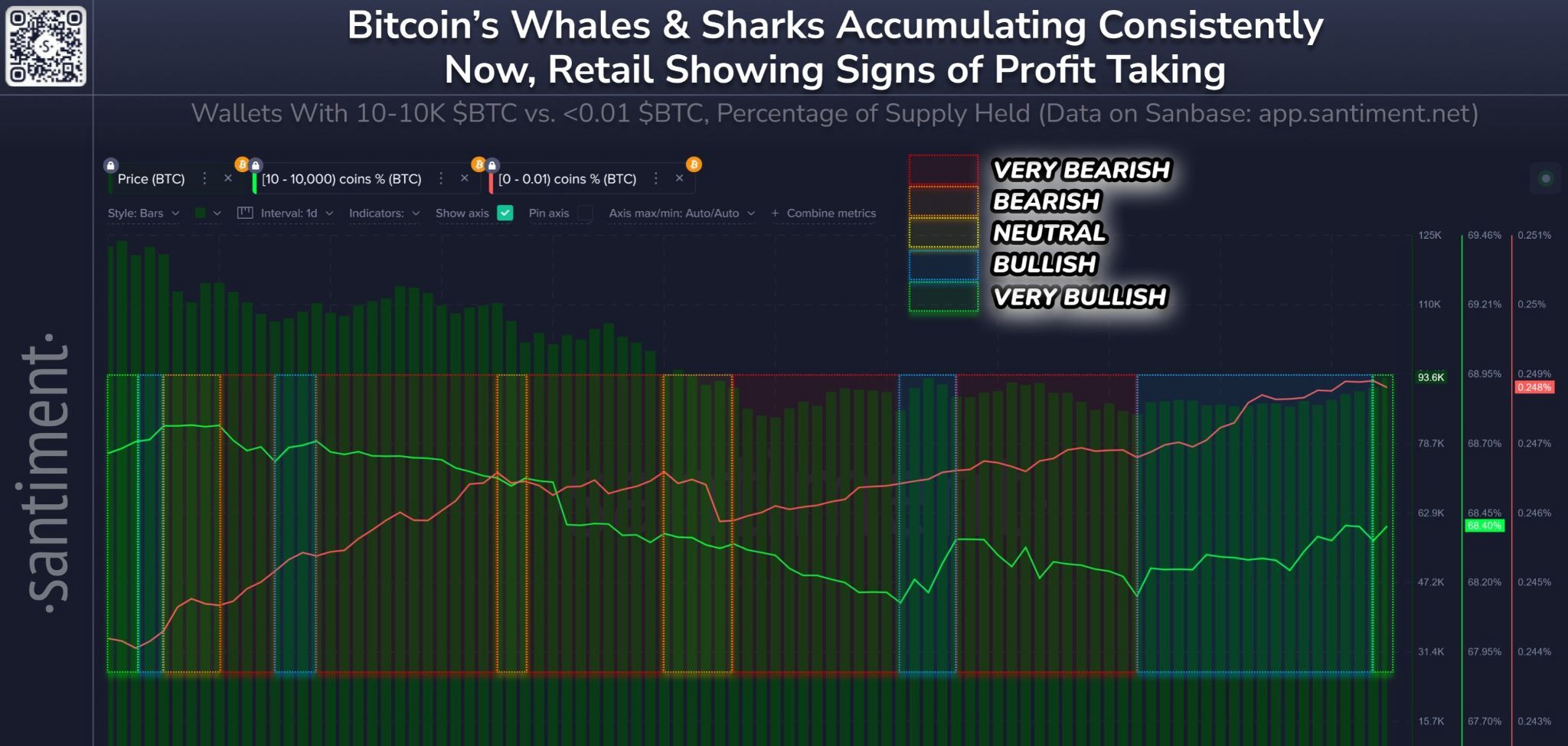 根據鏈上分析平台Santiment,鯨魚和鯊魚的比特幣持有量增加,以及散戶的獲利了結,可能被視為看漲信號,並引發更多的市場上行動能。