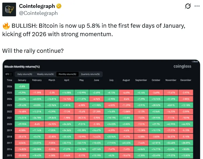 根據CoinGecko數據,比特幣目前交易價格為93,750美元,較10月6日創下的126,080美元歷史高點下跌25.6%,但在2026年迄今已上漲7.1%。