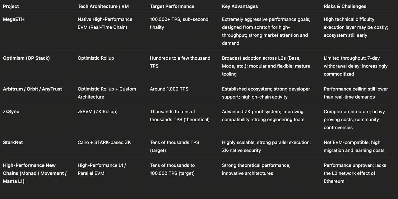 MegaETH 并非市场上唯一追求超低延迟、高吞吐的新项目。它与同期竞品在技术路线上各有侧重:
