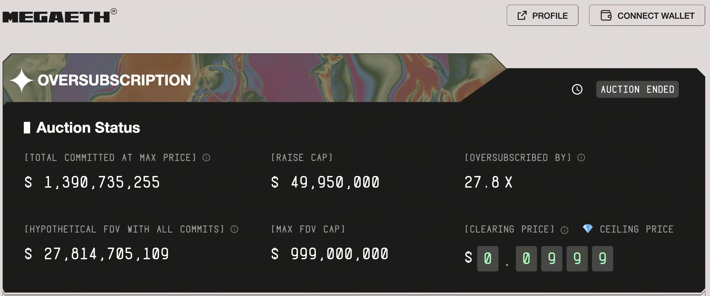 MegaETH 的融资过程和代币发售在市场上引起了巨大关注。项目代币总量为 100 亿枚,其中 5%(5 亿枚)用于公开拍卖。2025 年 10 月的社区公募在 Cobie 创立的 Sonar 平台上进行,采用英式拍卖模式:起拍价 0.0001 美元/枚(FDV100 万美元),最高封顶价 0.0999 美元/枚(FDV 9.99 亿美元),投标门槛为单笔最低 2650 美元、最高 186282 美元。最终共计约 13.9 亿美元的需求提交参与认购,超额认购约 27.8 倍。中标者均按照统一最终成交价获得代币,低价出价者将获得退款。公开发售后,MegaETH 在早期融资上共募集超 3000 万美元,其中包括 2024 年 6 月的 2000 万美元种子轮(领投方 Dragonfly)和 12 月通过 Echo 平台筹集的 1000 万美元社区轮。这些资金为项目后续开发和生态建设提供了支持。