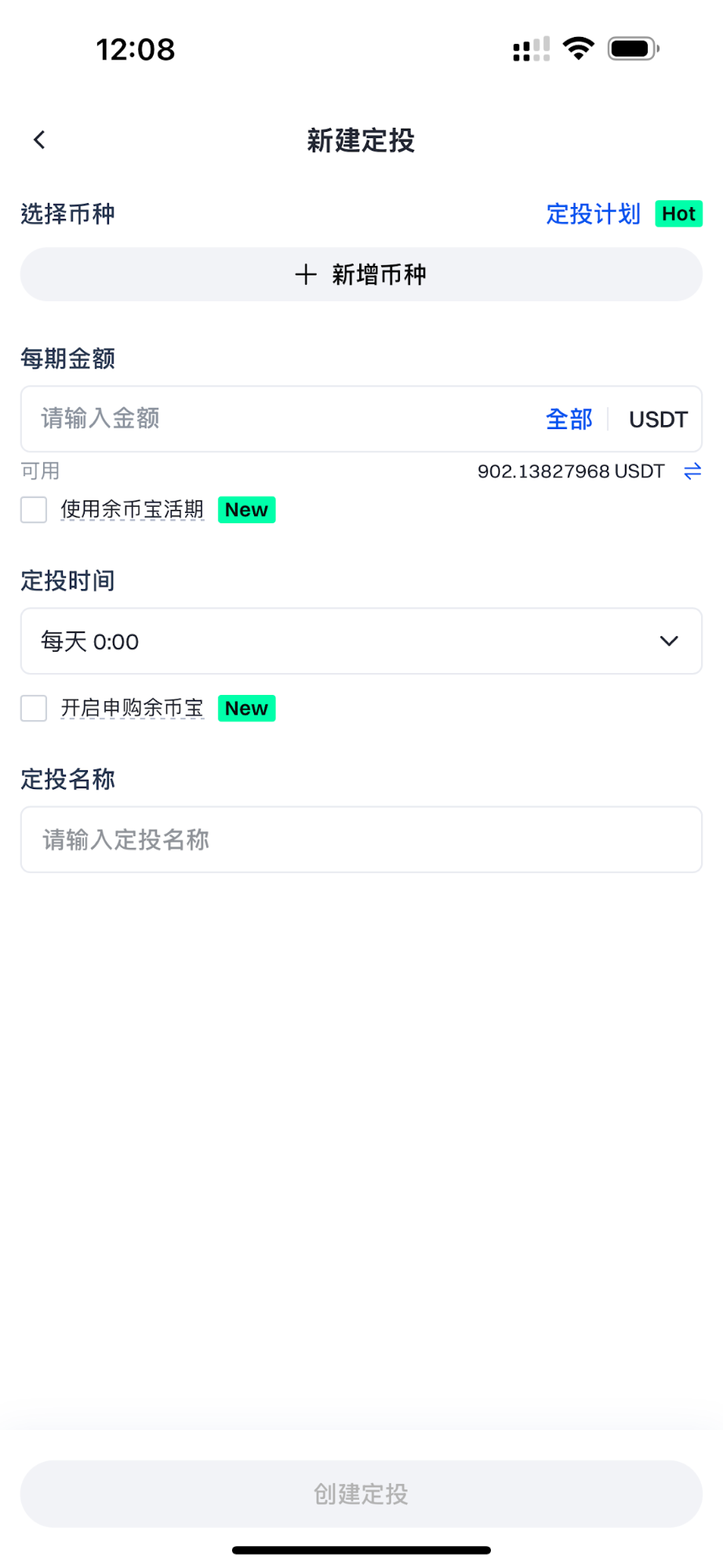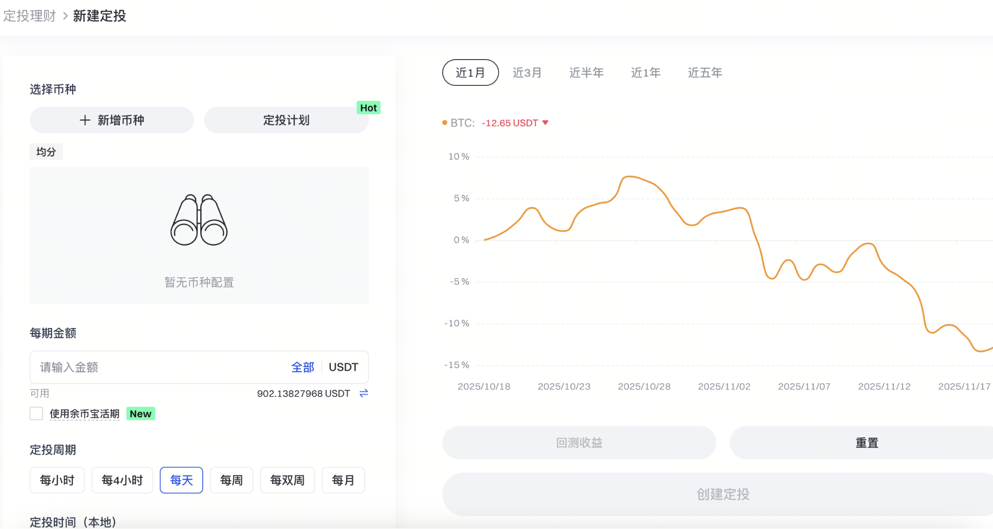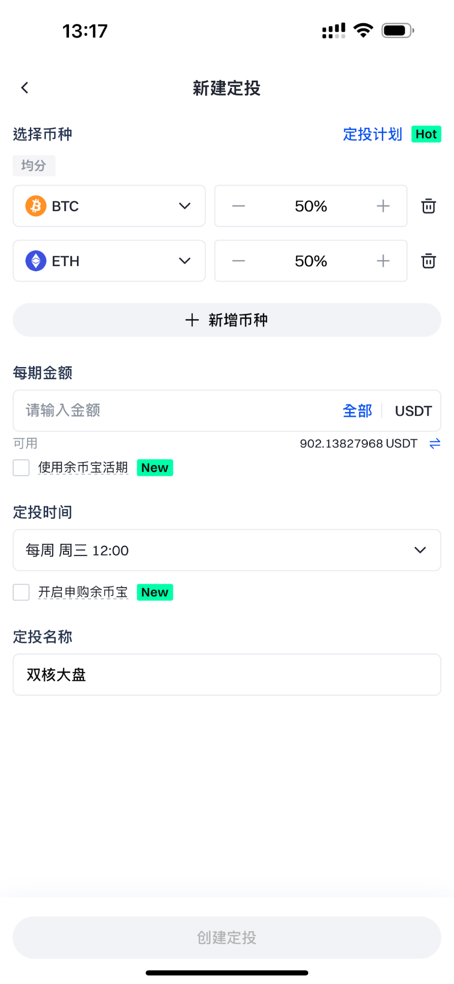 4.若是在定投首页选择“新建定投”,会进入空白无参数的 “新建定投” 页面,用户可自行输入定投周期、投资币种、每期金额、币种配置等信息,确认无误后点击“确认定投”,即成功创建定投策略。