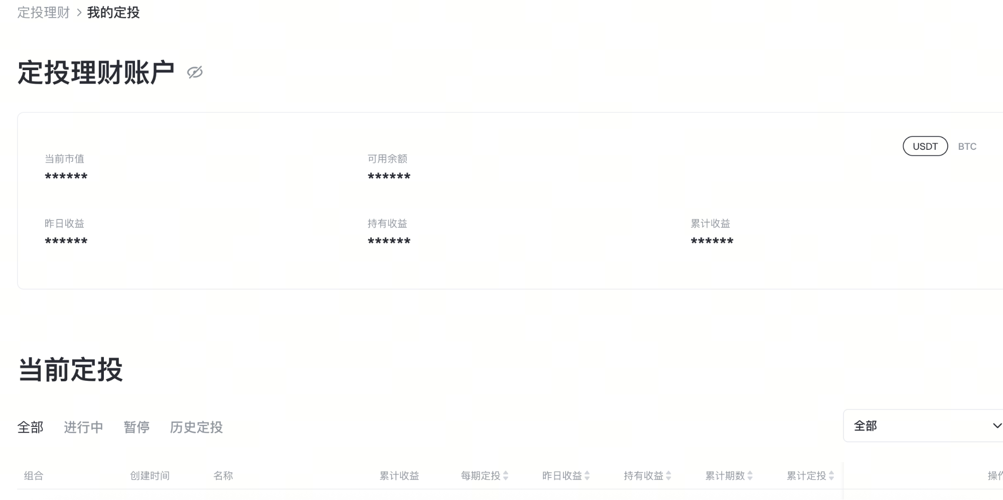 ❗️注意: 定投周期:定投策略执行买入的周期。投资币种:目前可使用 USDT、BTC 两种货币进行投资。每期金额:每次执行定投策略时投资币种的数量。目前最低投资门槛:1 USDT (USD) 或 0.001 BTC 。币种配置:自由选择定投的币种,单一策略最多 10 币种,占比最低 10%