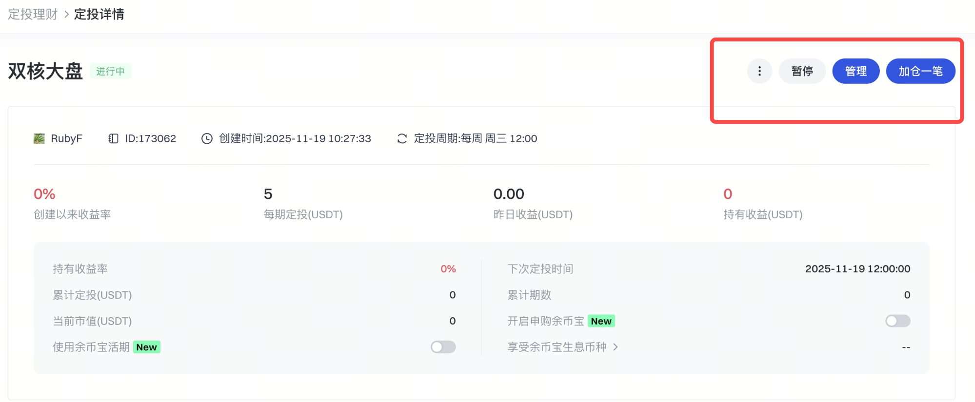 ❗️注意: 管理:可重新输入定投策略的配置,包含投资周期、每期金额、币种配置等。加仓一笔:再当日原定投基础上额外增加一笔交易,按比例买入定投的币种。暂停:点击后将暂停策略,但仍然可以重新激活。终止:结束定投策略,选择赎回已购入的配置币种或是投资币种。