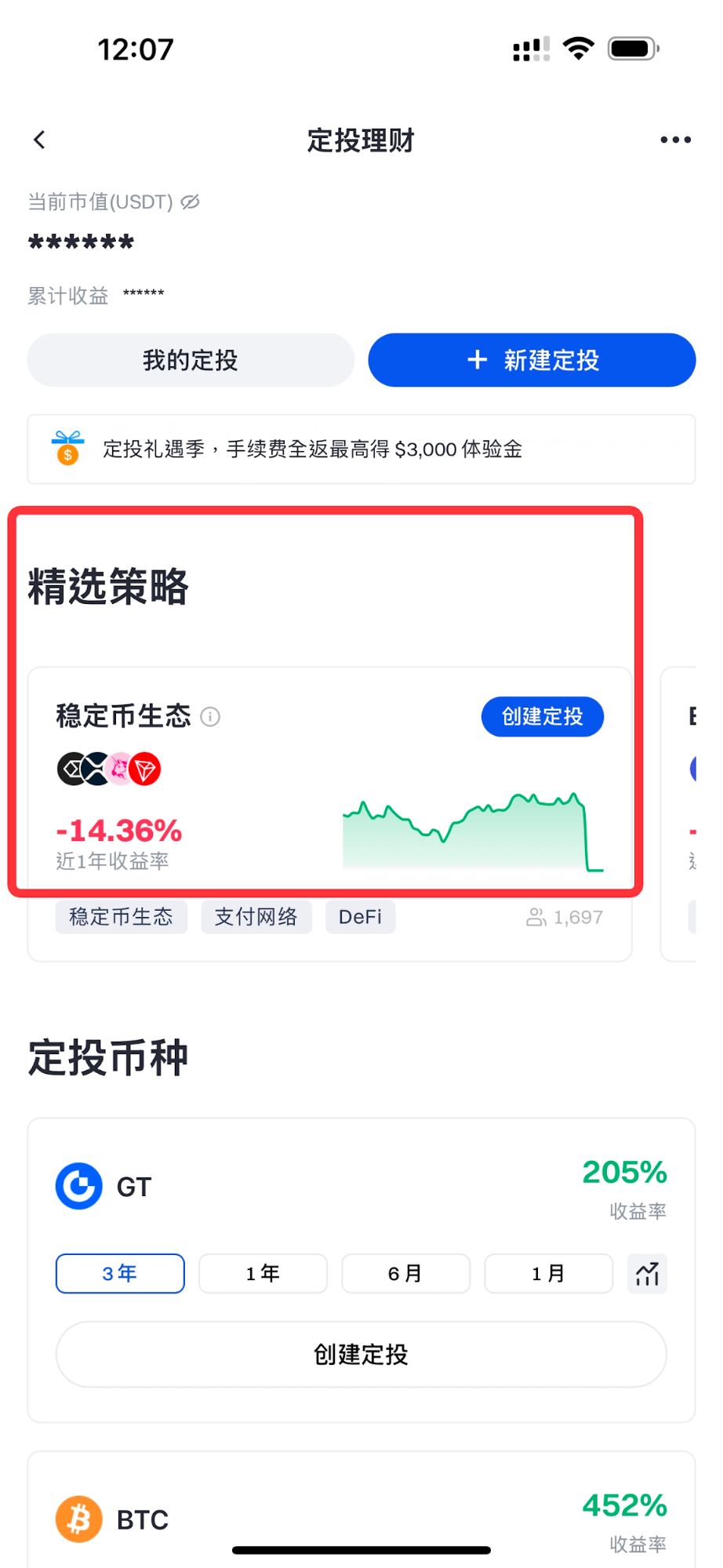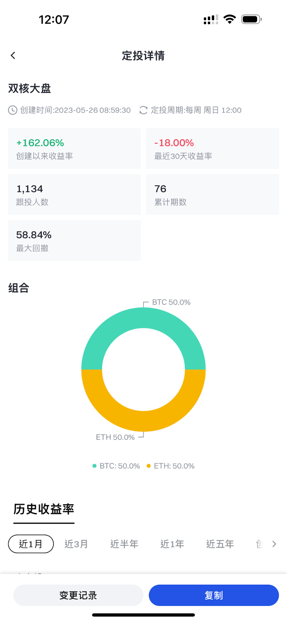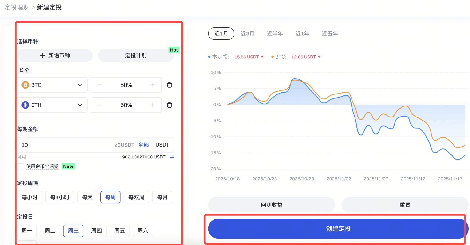 3.点击“创建定投”后会看到该定投策略的设定。在历史收益率下方选择回测周期,可观察不同周期的收益率。画面左侧则显示币种配置,若没问题即可点击“创建定投”。