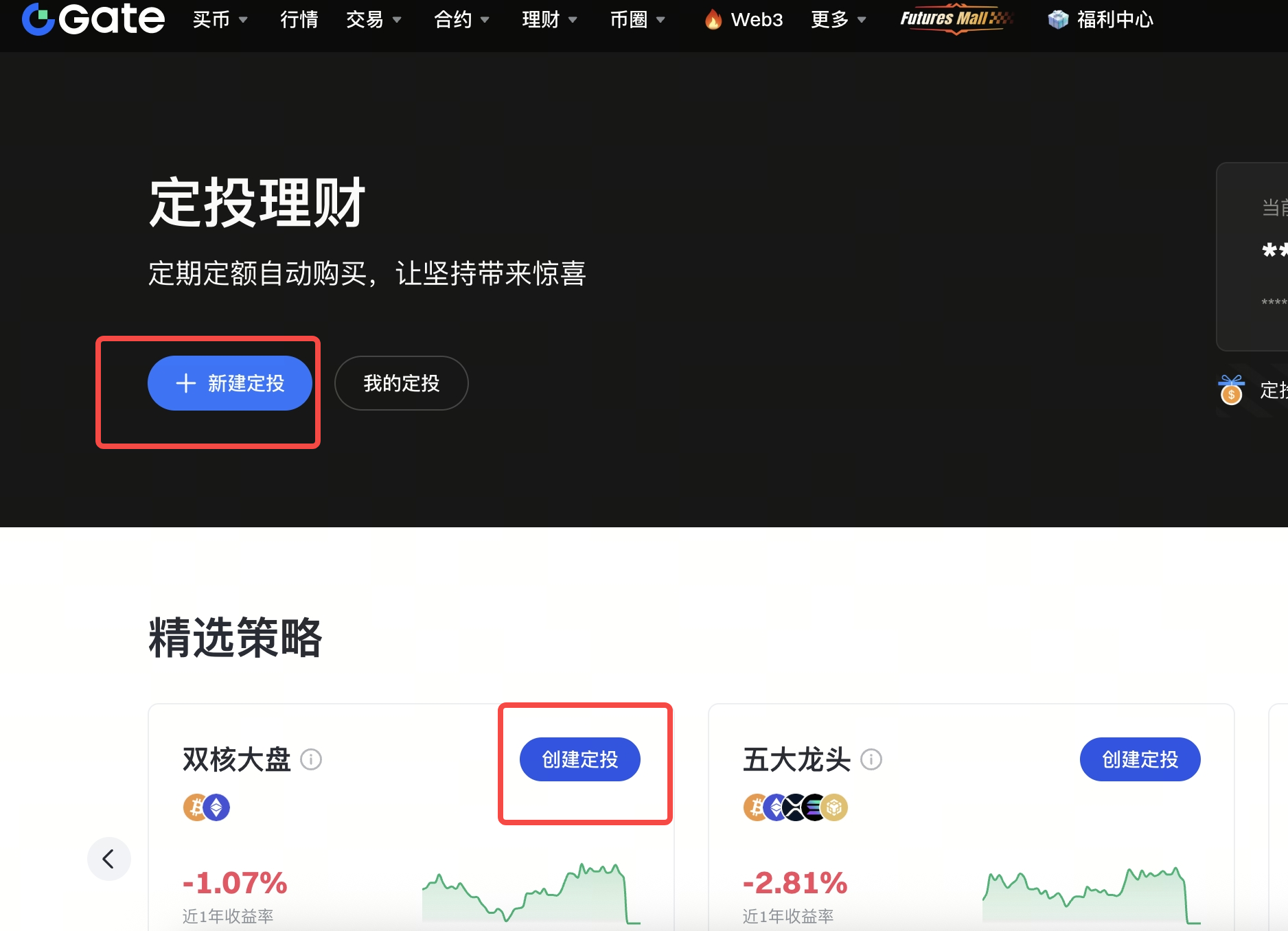 定投理财适合任何用户做被动式的投资管理,只需每隔固定周期买入固定金额的代币(需要确保现货账户/统一账户保留足够扣款的余额,否则会出现定投失败的情况),省去选择入场时机的烦恼。但是人工执行重复的买入操作不免有些麻烦之处,因此可以创建自己的定投机器人,来代替您自动执行定投策略,以下我们将以 Gate 赚币中的定投理财进行操作演示。