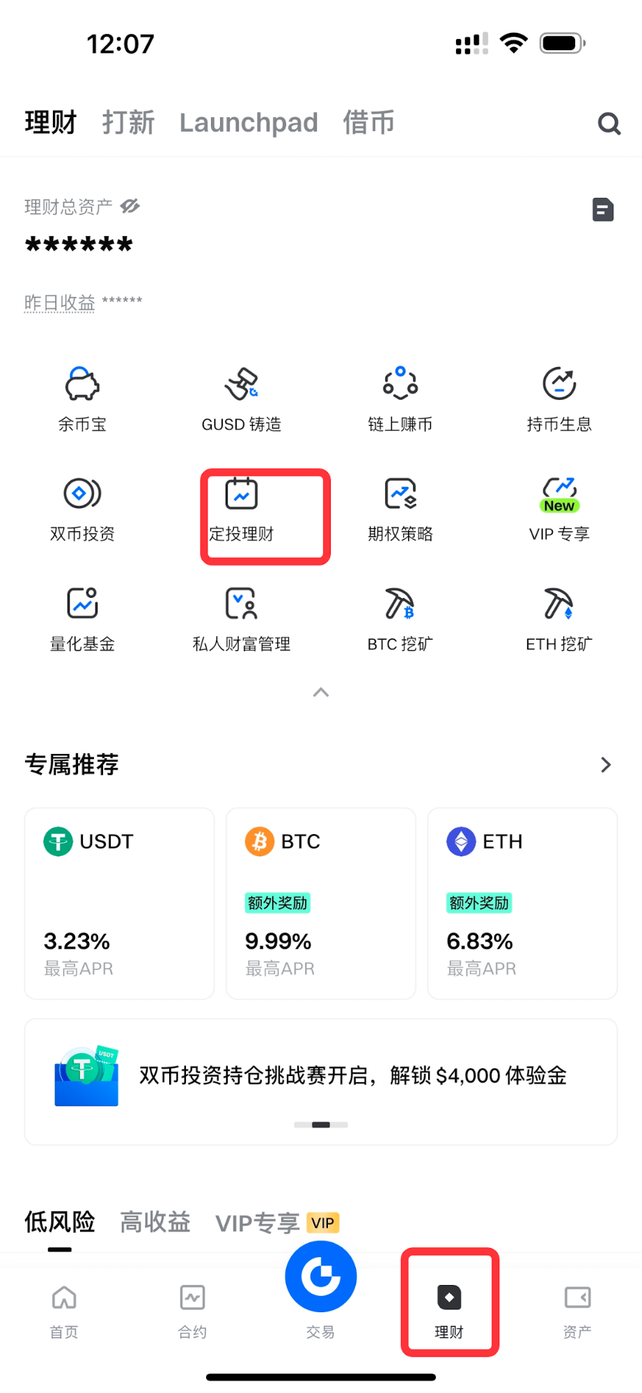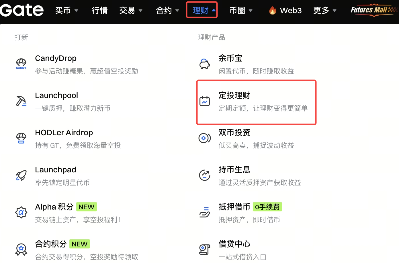 1.打开 Gate APP,找到理财栏目中的定投理财