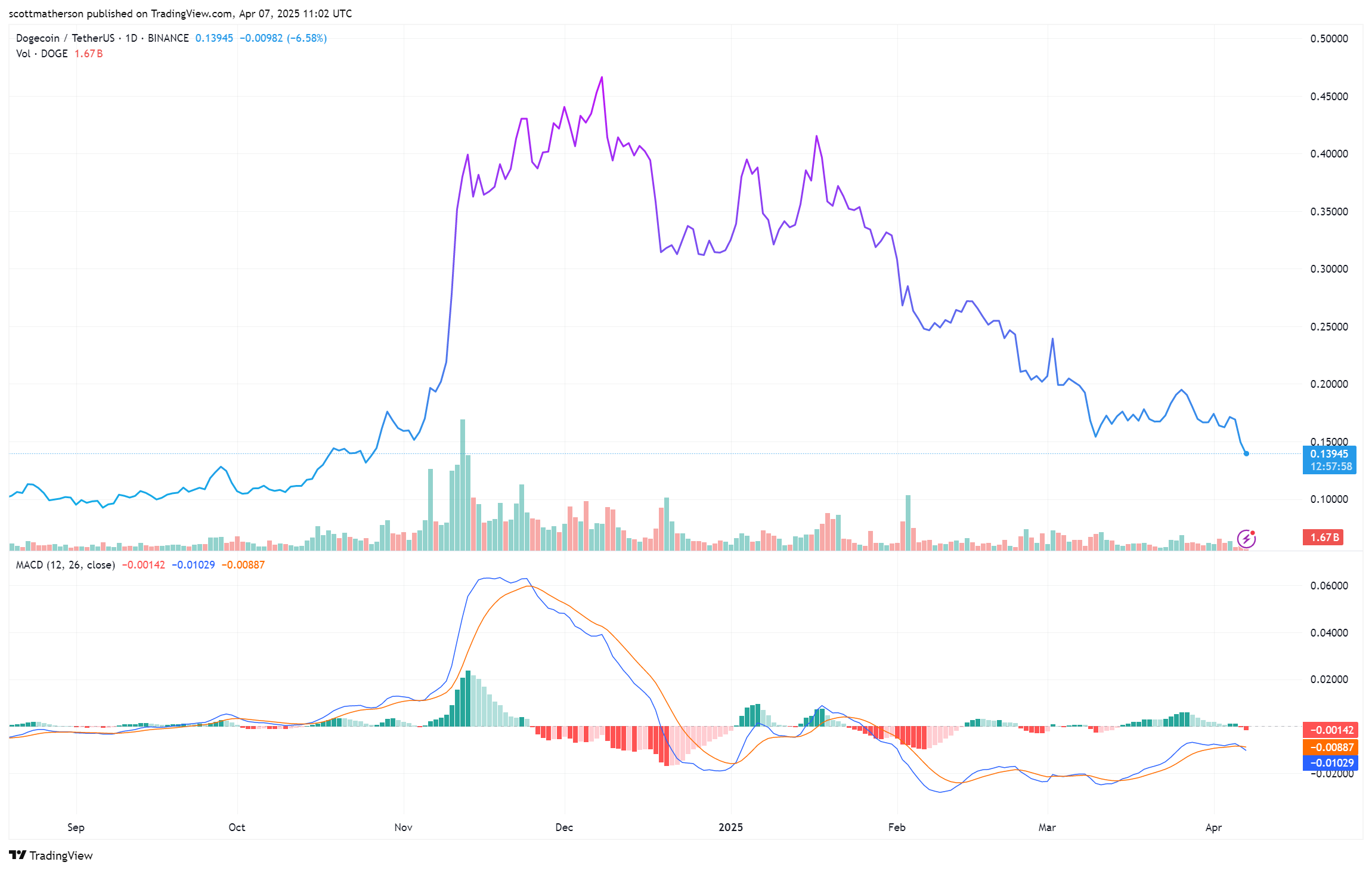!DogecoinDOGE 在一维图表上的交易价格为 0.13 美元 |资料来源:Tradingview.com上的DOGEUSDT特色图片来自Unsplash,图表来自 Tradingview.com