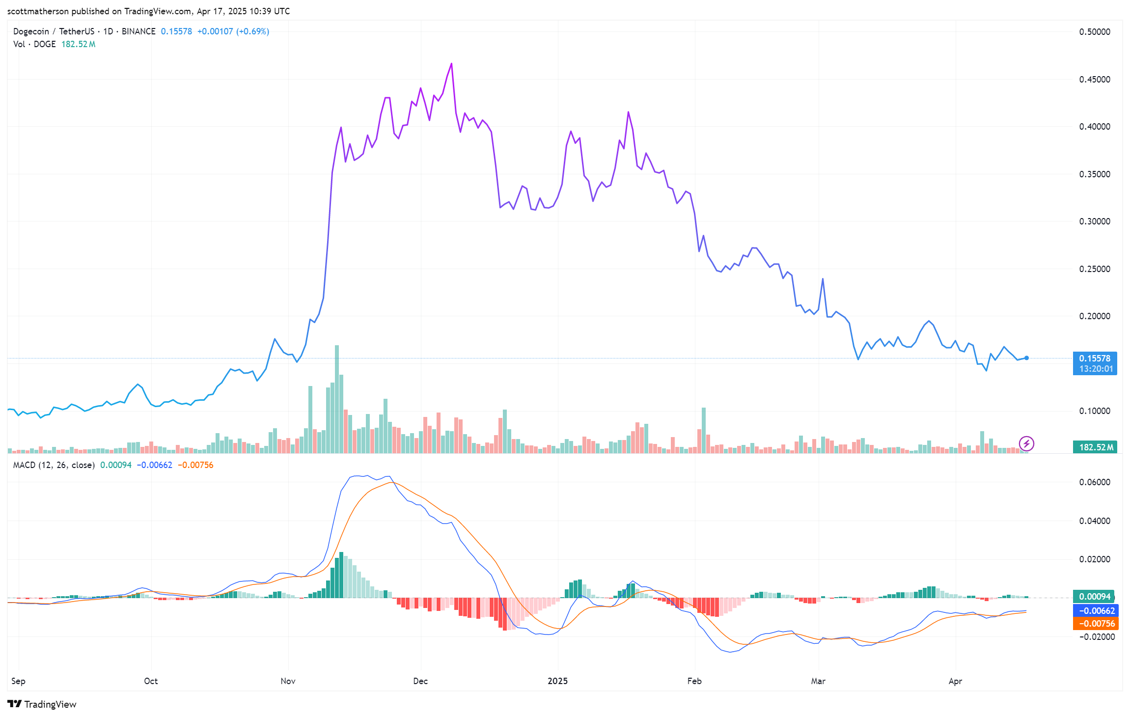 在撰写本文时,狗狗币的交易价格为 0.1557 美元,在过去 24 小时内上涨了 1.3%。另一方面,交易量在同一时间段内下降了 4.7%,降至 7.45 亿美元。